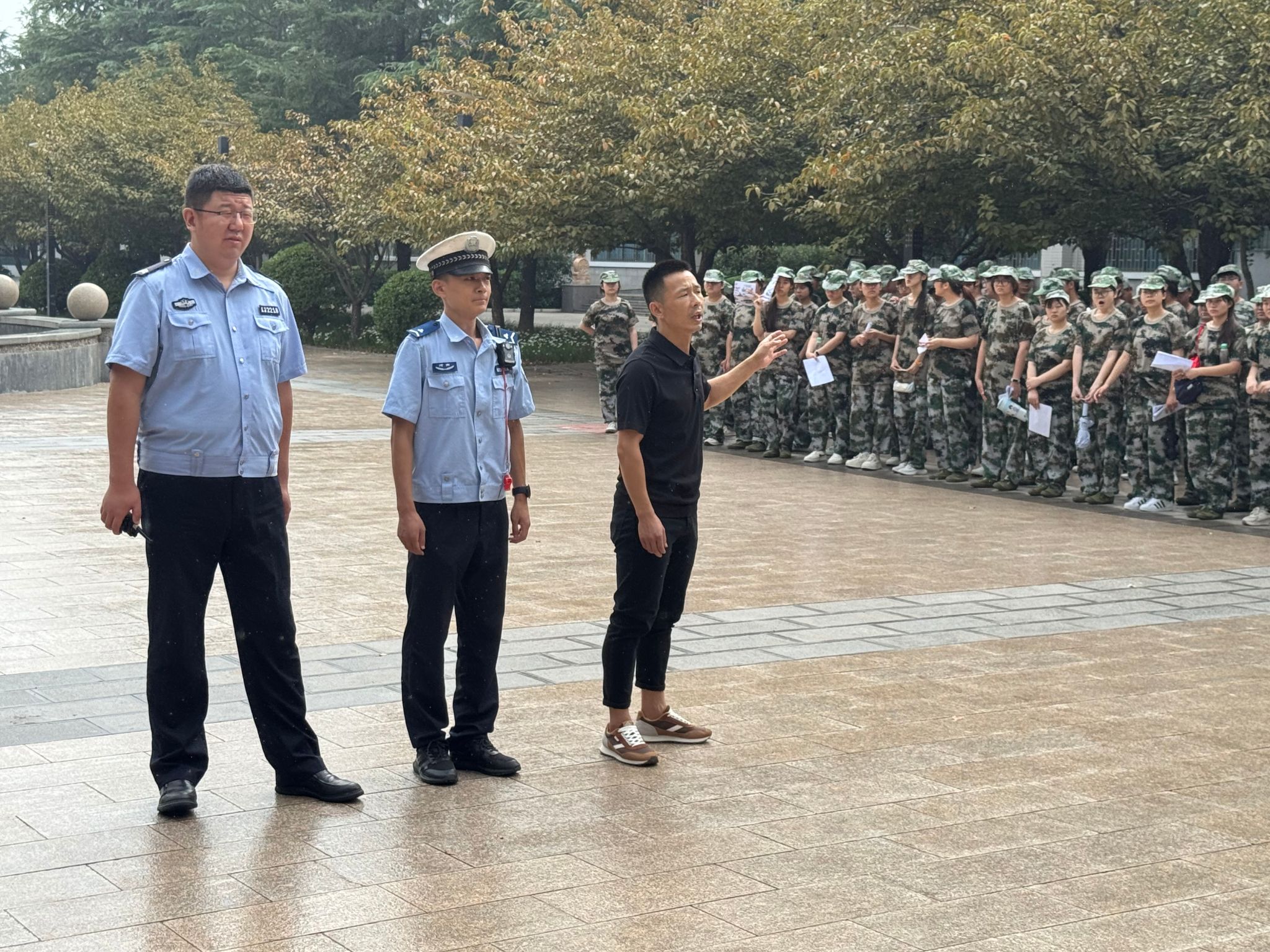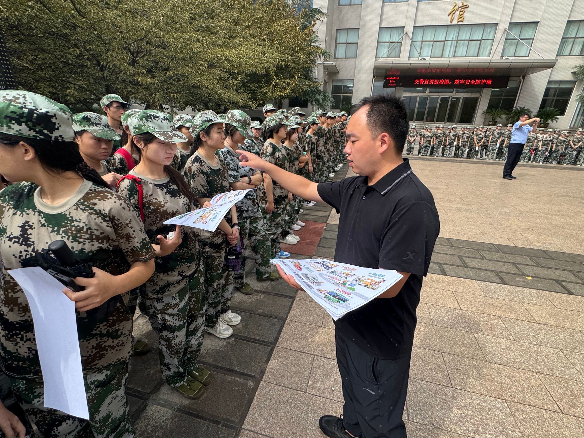 为增强新生交通安全意识,学校保卫处于9月15日上午10时,特邀郑州市公安局交通警察支队二大队魏警官与康警官来到我校,在樱花广场为正在进行军训的2025级新生带来了一场生动且深刻的交通安全普法教育活动。本次活动由学校保卫处牵头组织,后勤保卫党支部书记、保卫处副处长刘博出席,保卫处副科长何金标主持,300余名学生共同参与。本次宣传教育旨在增强新生交通安全意识,尤其针对校园内电动车骑行规范及校园周边道路交通安全问题进行重点讲解。
