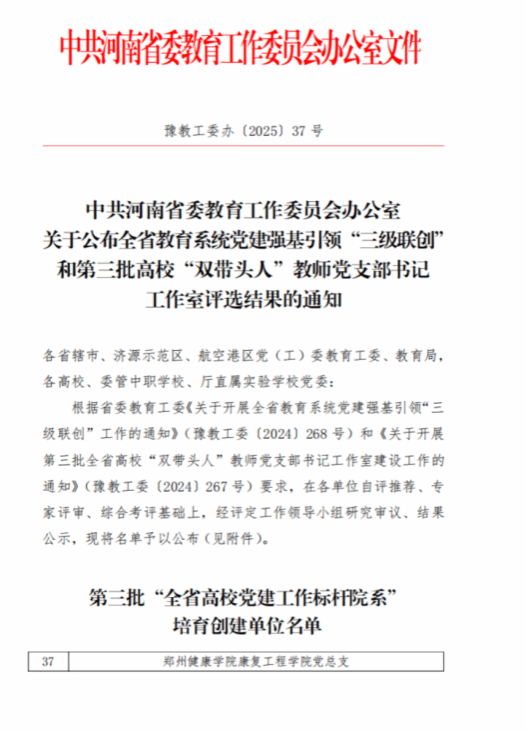 近日,中共河南省委教育工委办公室下发《关于公布全省教育系统党建强基引领“三级联创”和第三批高校“双带头人”教师党支部书记工作室评选结果的通知》文件,我校康复工程学院党总支获评第三批“全省高校党建工作标杆院系”培育创建单位,这是我校获批的第2个“全省高校党建工作标杆院系”培育创建单位,是“三级联创”建设取得的又一标志性成果,充分展现了学校基层党组织标准化规范化建设和“一总支一品牌、一支部一特色”创建活动取得的扎实成效。