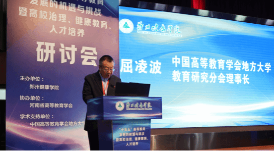 中国高等教育学会地方大学教育研究分会理事长屈凌波致辞。他指出,作为高等教育体系的重要组成部分,地方高校如何找准定位,发挥优势,加强治理体系建设,提高人才培养质量,积极回应教育强国建设的时代召唤。郑州健康学院作为本次研讨会的主办单位,在健康教育、人才培养等方面进行了积极的探索和实践,取得了显著的的成效。他表示,通过本次研讨会的交流分享,广大的地方高校一定能够进一步相互学习,相互启发,找准办学定位,积极探索并践行特色化、差异化的发展路径,构建互补共生的教育生态,为加快建设教育强国贡献地方高校的智慧和力量。