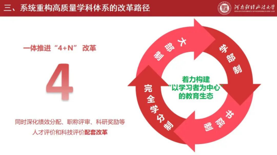 司林胜从明确一个目标、夯实两项基础工作、优化配置三类资源深化、一体推进“4+N” 改革介绍了学校在学科梯次发展、人才梯队建设、团队平台课题等学科资源配置方面的改革举措,重点介绍了学校学科治理体系学部制、书院社区化管理、学分制、大部制改革的具体做法,提出了淡化专业、强化课程的专业建设适配经济社会发展的思路。即推行基于自由选课的自然转专业;实施专业课程内容整合,减少专业课门数,夯实学科专业基础;增加跨学科专业选课空间,开办微专业,促进学科专业交叉融合;开设《批判性思维》《人工智能》通识课,设立“写作工坊”;加强课程团队建设等。