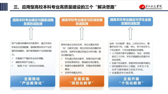 报告聚焦应用型本科高校服务国家战略的专业高质量建设要求,对目前应用型高校本科专业结构调整存在的三个突出问题,创新性提出三条破解路径:一是全面推动“产业教育化”,提高本科专业建设与国家战略急需的适配度;二是全面实施“项目化教学”,提高学校专业建设与区域发展的适配度;三是全面开展“个性化教育”,提高本科专业建设与学生全面发展的适配度。他结合黄河科技学院的办学经验,从体制机制改革、产业需求导向、课程体系创新重构、质量保障和数智化赋能五个方面,积极开展综合改革与创新实践,有力提高了专业建设与国家战略、区域发展、学生成长的适配度,为应用型高校深化改革提供了有益借鉴。