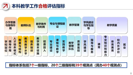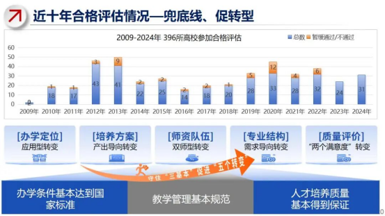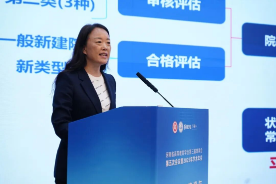 她指出,合格评估是对学校人才培养工作的全链条全方位检验,是学校发展的重大机遇,能够推动学校明确办学定位、完善内部管理、优化资源配置,实现从“保合格”到“上水平”的跨越式发展。她表示,近10年参评学校中,民办高校占比总体增高,已逐渐成为合格评估参评学校主体,但合格评估结论不容乐观。随后围绕近几年合格评估院校参评总体情况,剖析了民办高校合格评估中存在问题。她建议,一要透彻学习文件,二要以评促建,以评促强,推动学校改革发展,三要找准差距,坚定补足。她强调,民办高等要突出服务地方(行业)经济和社会发展、培养应用型人才培养的办学定位,构建并逐步完善内部质量保障体系,实现从“保合格”到“上水平”“追卓越”的跨越式发展。
