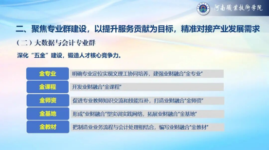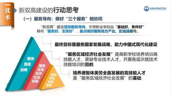 通过“服务导向、建设布局、绩效评价”三大维度,她提出高职院校应注重“扶需扶特”,聚焦国家战略和区域经济发展需求,优化专业群布局,提升产教融合质量。在实践层面,报告从校准与地方经济的“契度”、增进与行业企业的“融度”、加强“五金”建设的“力度”、提升国际影响的“誉度”详细阐述了双高建设的经贸实践与建设方案。同时,报告强调了“五金”建设的重要性,即打造金专业、金课程、金教材、金教师、金基地是全面提升高职院校的关键办学能力。此外,报告还提出了“教随产出、产教同行”的职教出海行动,推动职业教育国际化,输出中国职教标准,服务“一带一路”建设。