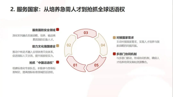 在“标准构建”方面,嵩山少林武术职业学院以国家需求为引领,夯实职业教育根基,制定758项新标准,构建四级标准体系,并成功注册武术国际标准《武术学习服务指南与要求》。在“融合发展”方面,学院深化产教融合,服务区域与国家发展格局,培养“少林”特色人才,并积极参与国际标准制定,抢抓全球话语权。在“职教出海”方面,学院通过国际交流活动,将少林武术融入全球体育与文化体系,推动中华武术传播。在“未来展望”中,刘少鹏强调标准化是高质量发展的催化剂,学院还倡议共建标准创新联合体、建立标准贡献度评价体系、设立特色职教标准出海计划,推动中国职业教育标准走向世界。