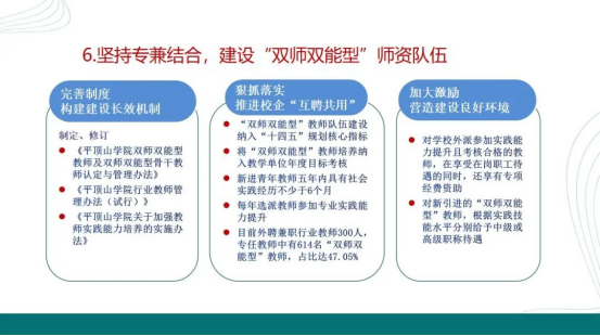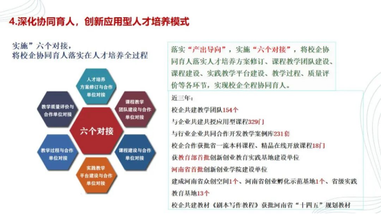 他表示,在创新应用型人才培养方面,平顶山学院全面实施“项目化+导师制”育人,使每一名学生都至少跟一位导师,每一位导师都至少带一名学生,以“创意—创作—创新—创业”为教育主线,引导学生实现“作业—作品—产品—商品”的飞跃。出台《平顶山学院开放实验室管理办法》《平顶山学院学分银行管理规定》,实行“第二课堂(实践教学)成绩单”制度。完善应用导向考核体系,鼓励教师在各级各类教科研项目、产学研合作项目中吸纳学生参与,指导学生开展课题研究、创新创业就业训练、学科竞赛等。