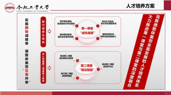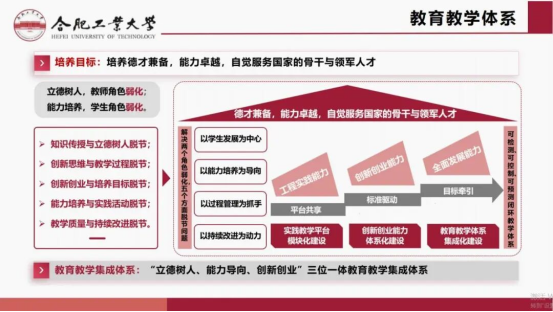 她以合肥工业大学教育教学综合改革为例,具体说明专业结构调整、课程建设、复杂工程问题能力改革及质量保障体系等方面的实践做法。她介绍了合肥工业大学构建了学生在大一学习跨专业、多专业的工程基础知识,大二参与校内共建基地综合实践实验和校外企业实操、技术培训,大三参加学科竞赛,大四阶段参与企业合作项目研究的“学赛练研”的人才培养模式。