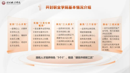 她介绍,开封职业学院通过构建“1+6”产教融合模式,打造校企命运共同体,实现了专业群与产业链的精准对接,为区域经济高质量发展注入动力。在“双向赋能”方面,学校紧密对接行业需求,围绕“德技并修新工匠”的培养目标,凝练了“5个3”人才培养特色,通过“三心并育”“三奖引领”“三大抓手”“三个坚持”和“三项对接”,全面提升学生职业技能与综合素质。在产教融合方面,学校与京东数字经济产业学院等企业深度合作,推动技术研发与成果转化,助力农村电商交易额年均增长超30%。此外,学校积极拓展国际合作,推动学历提升与学分互认,为师生提供深造机会。她表示,未来学校将继续深化产教融合,探索职业本科教育改革,为区域经济发展培养更多高技能人才,为新时代职业教育发展贡献力量。