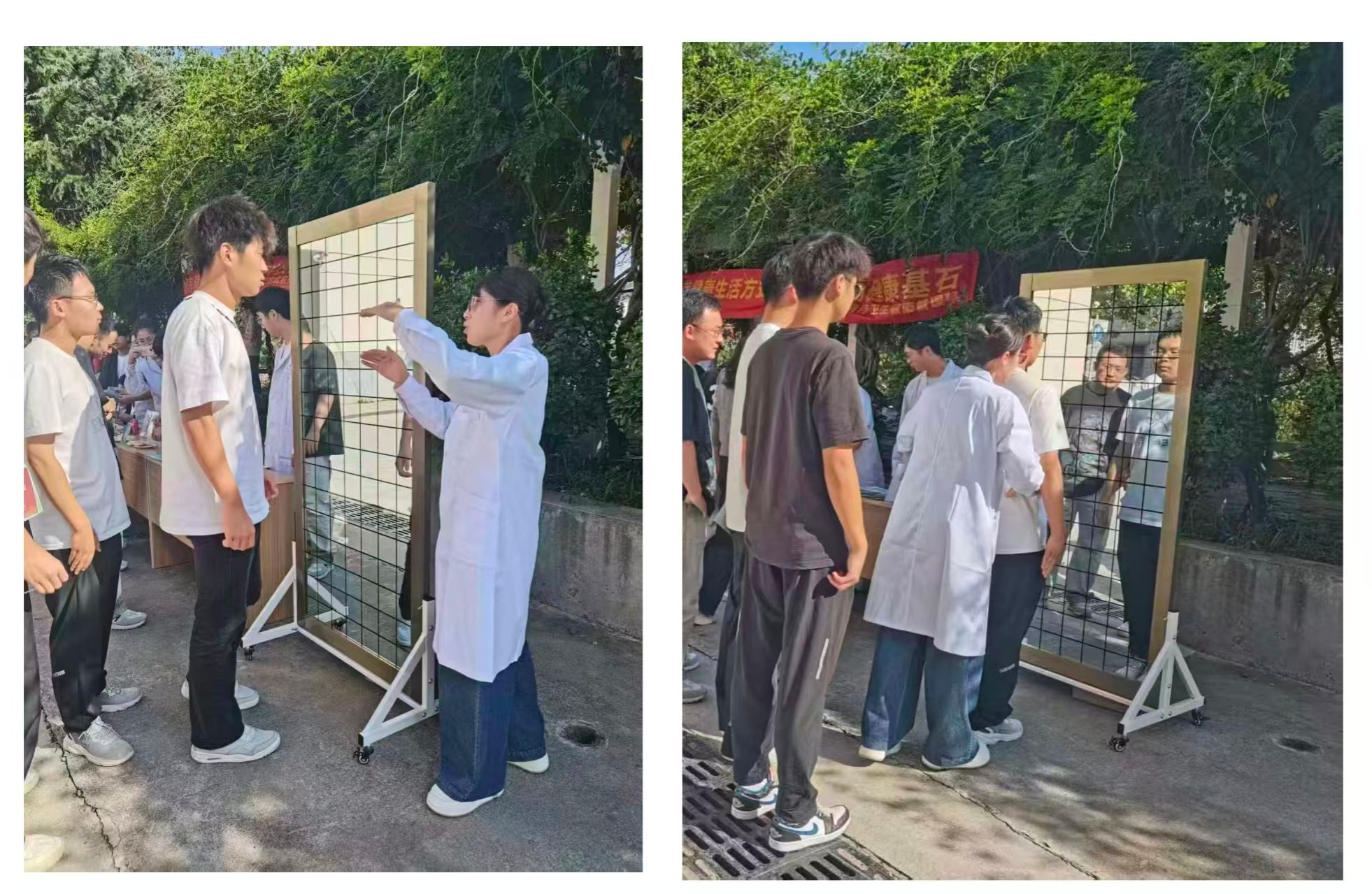 体态矫正互动区创新引入人体矫正镜,直击师生久坐导致的体态问题。在专业教师指导下,有的学生通过矫正镜直观发现自己存在高低肩、含胸驼背等问题,学习“靠墙站立3分钟”“脊柱放松操”等矫正动作,志愿者同步示范正确坐姿与站姿要领,帮助师生建立“看镜自查、随时调整”的体态管理习惯,接待体验者超150人次。