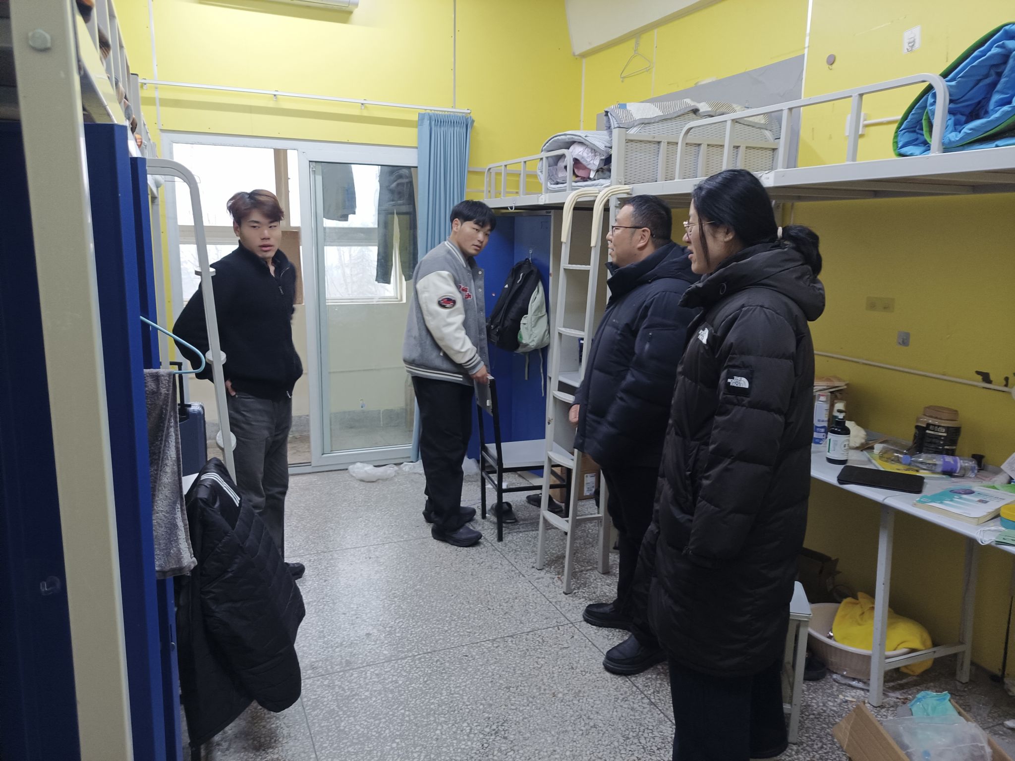 班会结束后,杨平副书记、贾坯坯主任带领辅导员深入学生宿舍,开展全覆盖安全卫生检查。重点核查学生返校到寝情况,细致排查私拉乱接电线、违规使用大功率电器、杂物堆积等安全隐患,现场督促整改不规范问题;同时与同学们亲切交流,详细了解返校适应、生活需求与学习规划,叮嘱大家做好春季传染病预防,保持宿舍通风整洁,共建安全、文明、温馨的住宿环境。
