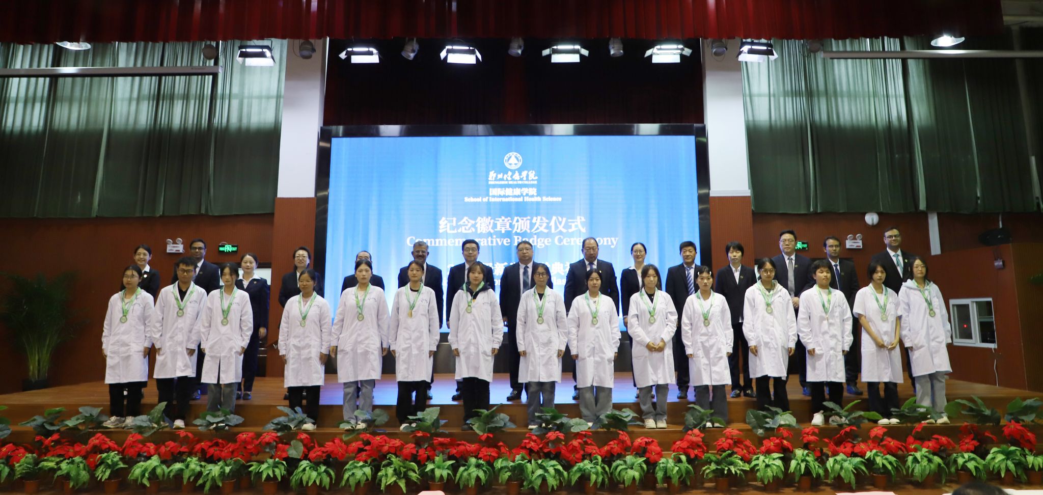 音乐余韵未散,典礼进入徽章佩戴环节。郑州健康学院与亚洲医药科技大学共15位领导上台为新生逐一佩戴纪念徽章。徽章设计独具深意,正面融合两校校徽元素,背面刻有“健康启航”字样与国际健康学院标志,既是新生身份象征,更是其肩负健康使命的见证。徽章别胸前,誓言记心间,心愿折纸向远方,简短仪式完成了精神洗礼与身份加冕。自此,2025级新生不仅是学院一员,更是“健康中国”与“世界健康”的建设者、接力者。