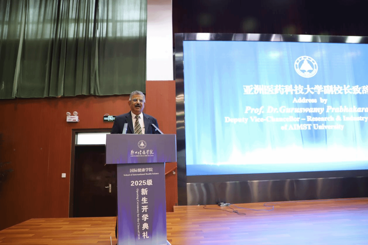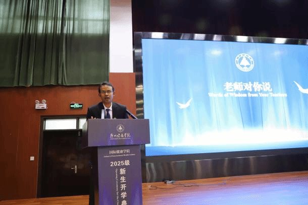 刘国际代表郑州健康学院向现场朝气蓬勃的2025级新生致以热烈欢迎,同时向远道而来、专程出席典礼的马来西亚亚洲医药科技大学副校长Snr. Assoc. Prof. Dr.G. Prabhakaran表达诚挚感谢。他殷切期望新生们能以开放包容的心态拥抱多元文化,以扎实的专业学识夯实基础,在健康领域追逐梦想、贡献力量。