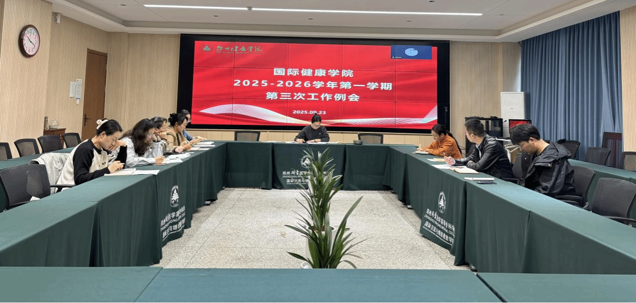 为总结回顾近期工作成效,并就下一阶段重点工作进行安排,2025年9月23日上午,国际健康学院在综合教学楼207会议室召开2025-2026学年第一学期第三次工作例会。国际健康学院院长许颖波,副院长陈容、毛亚刚,办公室副主任张莹莹等全体教职工参加会议,此次会议由社会服务与国际交流党总支书记、国际健康学院常务副院长张娟主持。