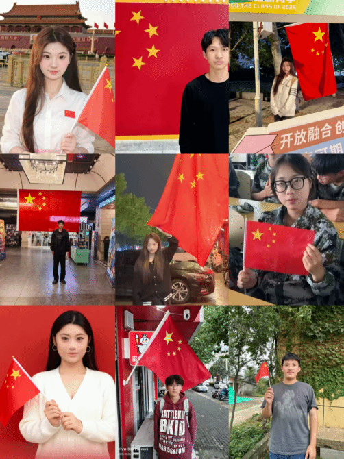 活动中,鲜艳的五星红旗成为最耀眼的 “背景”—— 有的同学手持国旗在校园标志性建筑前微笑定格,有的将国旗与国庆元素巧妙结合,用镜头记录下与祖国同庆的美好瞬间。一张张朝气蓬勃的青春面庞与鲜红国旗同框,每一幅画面都充满仪式感,每一个笑容里都饱含对祖国的真挚祝福。