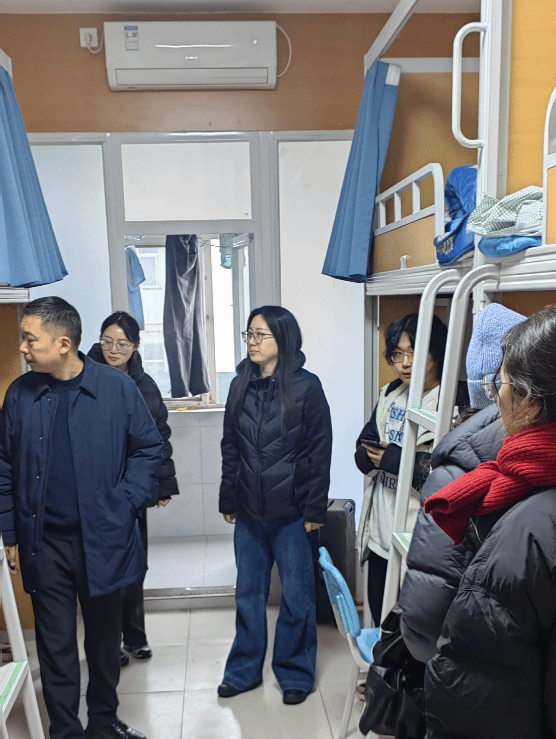 “孩子们住在这里,安全和舒适是第一位的。”检查过程中,许颖波院长和张娟书记始终牵挂着学子们的住宿体验。每走进一间宿舍,他们都先笑着和返校的学生打招呼:“家是哪里的?物品收拾好没?有什么困难随时跟老师说。”随后便仔细查看床铺稳固性,用手轻轻晃动床架,转头对学生叮嘱道:“睡觉前一定要检查床栏是否扣好,上下床慢一点,千万别着急,安全第一。”查看水电线路时,许院长特意指着插座提醒:“手机、电脑充电一定要用合格的充电器,充满就及时拔掉,别整夜插着,也别在床头堆太多杂物,避免遮挡插座引发隐患。”张娟书记看到宿舍角落通风稍差,她又叮嘱道:“天气变化大,宿舍要经常开窗透透气,既能保持空气清新,也能减少细菌滋生,照顾好自己的身体才是最重要的。”