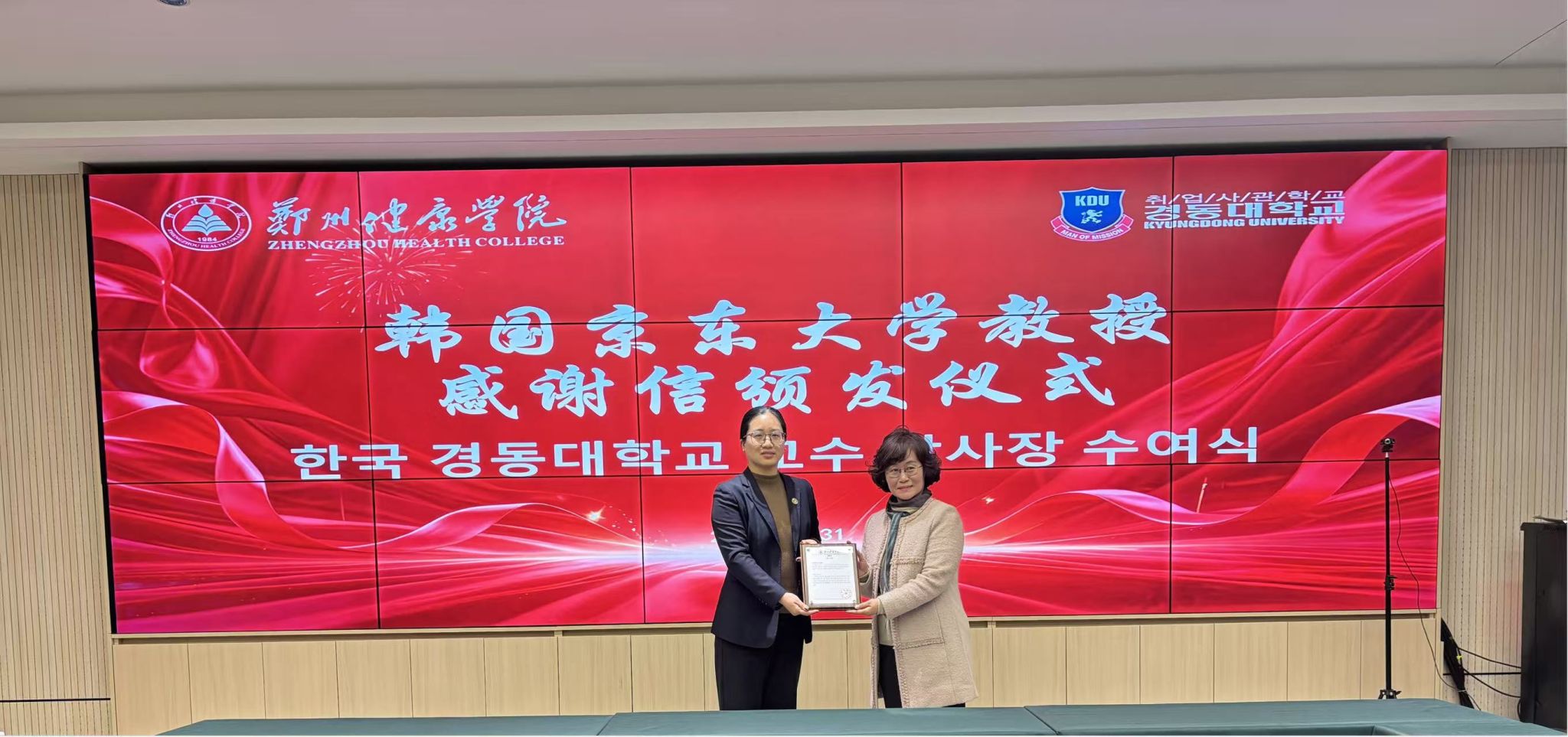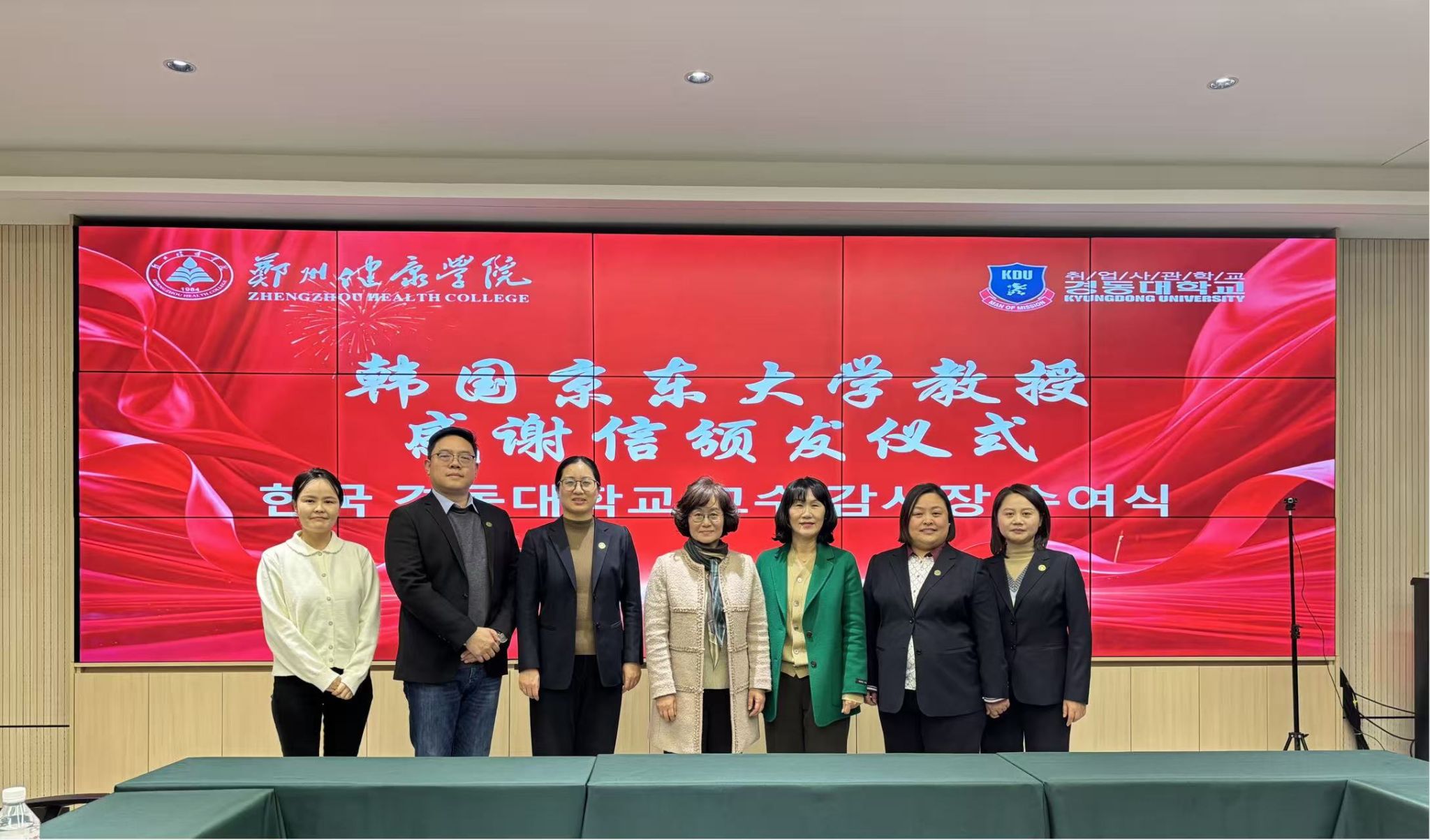 12月31日下午,韩国京东大学教授感谢信颁发仪式在综合教学楼207会议室顺利举行。仪式由国际教育学院副院长陈容主持,社会服务与国际交流党总支书记张娟、健康护理学院常务副院长豆银霞及国际交流与合作处副处长毛亚刚等共同出席。