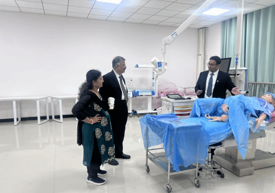 实训室内,先进的模拟诊疗设备、标准化的护理操作平台、高精度的医学检验仪器及功能完备的实训工位,直观展现了我校在实践教学硬件建设上的投入与成果。参观过程中,面对现代化的实训环境与精良的教学设备,Snr. Assoc. Prof. Dr. G. Prabhakaran教授频频驻足交流,对我校以高水平实训平台支撑高质量医学教育的理念给予高度评价,直言“这里的实训条件对学生的实践能力培养具有极大的推动作用。”