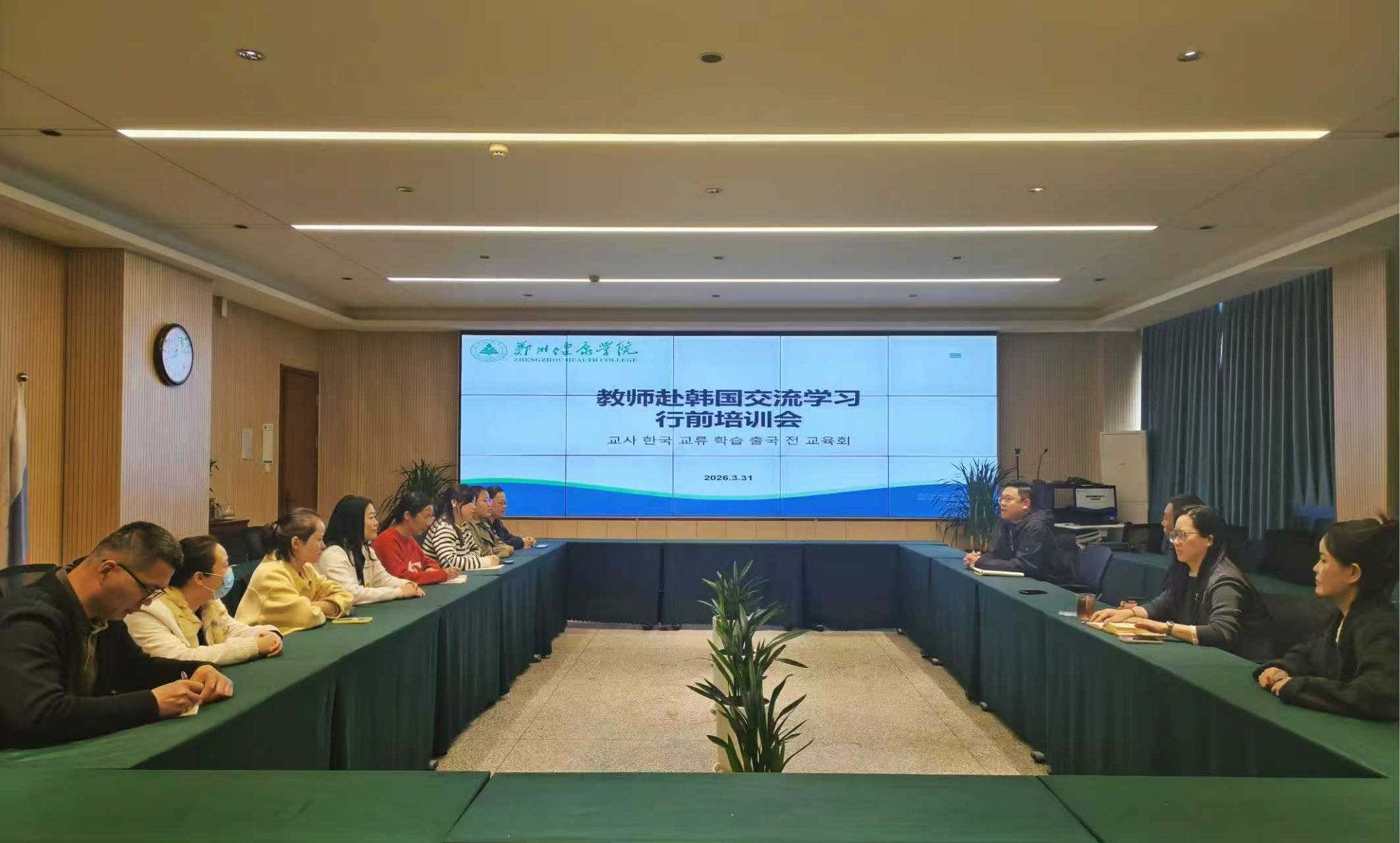 4月1日中午,郑州健康学院教师赴韩国交流学习行前培训会于综合教学楼207会议室召开。会议由国际交流与合作处副处长毛亚刚主持,国际交流与合作处处长、国际教育学院院长许颖波、社会服务与国际交流党总支书记张娟、国际教育学院韩语教师丁文宁及全体出访教师参加会议。