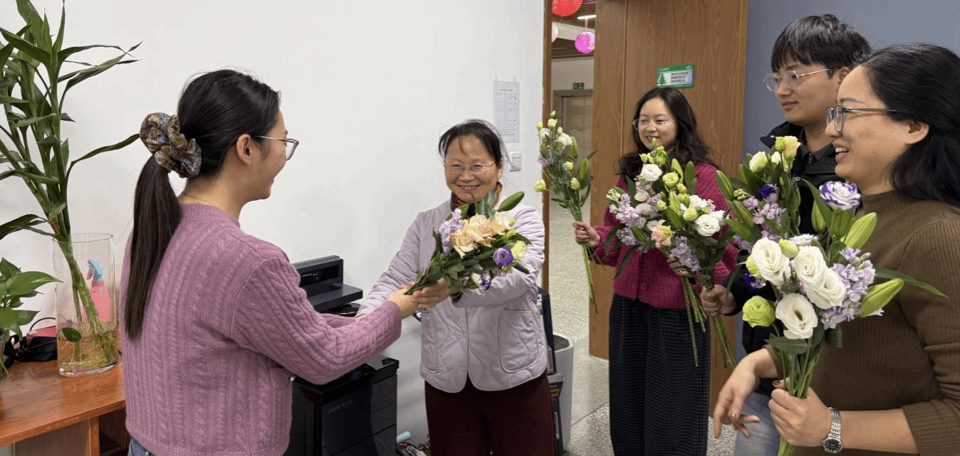 支部成员亲手将花束交至各办公室人员手中,并亲切交流,询问工作情况,感谢大家的辛勤付出。