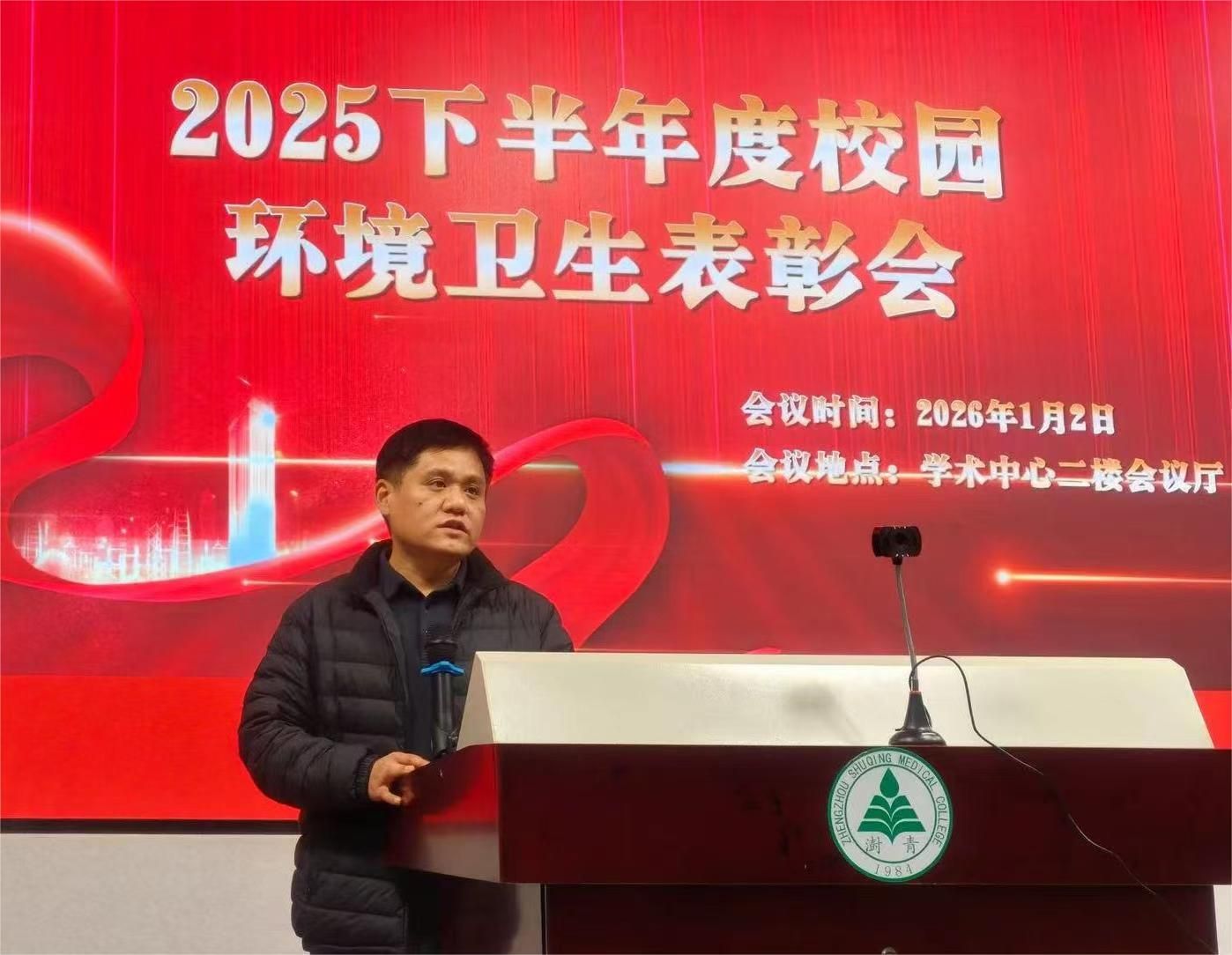 为表彰先进典型、弘扬敬业精神,进一步提升后勤服务质量与校园环境卫生水平,1月2日,郑州健康学院后勤处在学术中心报告厅召开2025年下半年校园环境卫生表彰大会。后勤处处长廖明辉、副处长刘志刚、杨思戊,以及后勤服务中心、商业街商户、食堂工作人员、物业工作人员代表参会,会议由刘志刚副处长主持。
