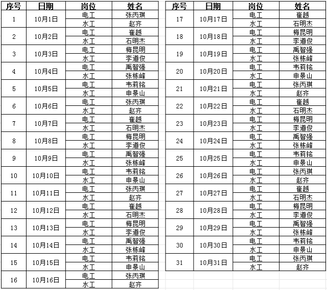 后勤处水电10月值班表