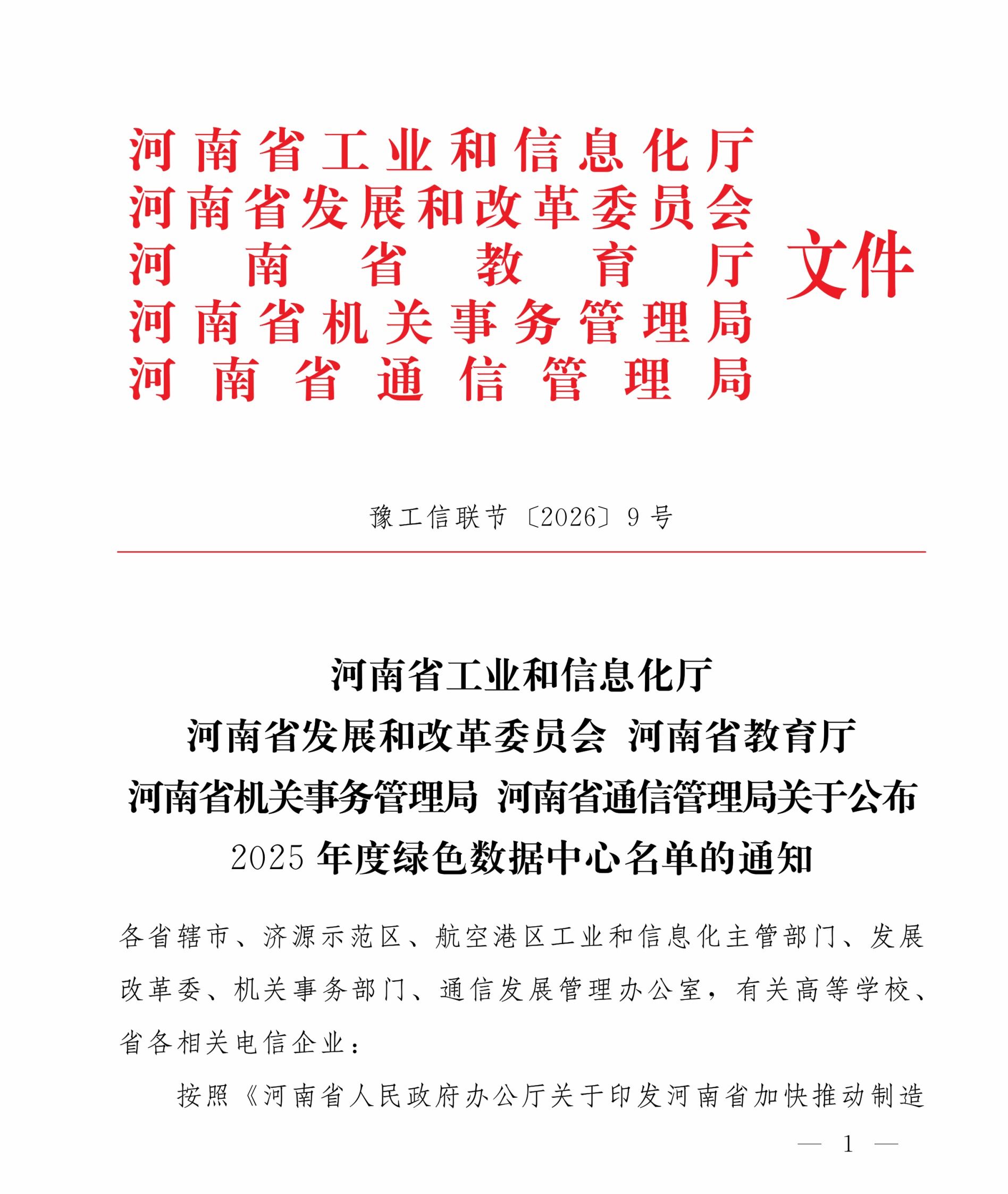近日,河南省工业和信息化厅、河南省发展和改革委员会、河南省教育厅、河南省机关事务管理局、河南省通信管理局联合印发《关于公布2025年度绿色数据中心名单的通知》(豫工信联节2026〔9〕号),我校应用系统数据...