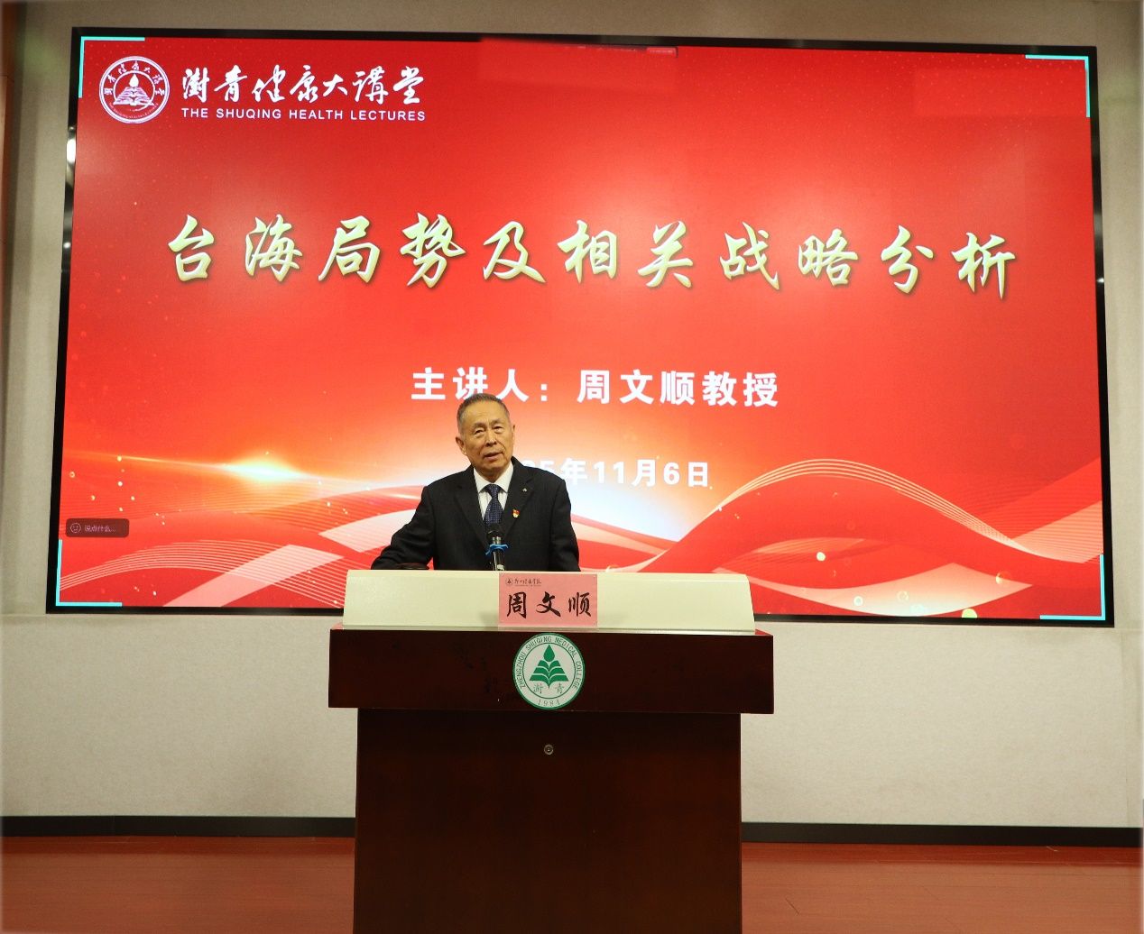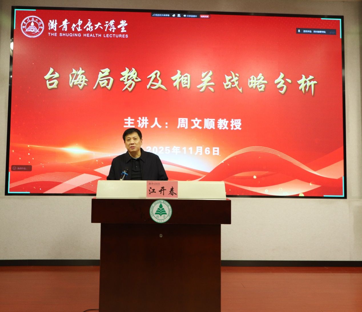 为深入学习党的二十届四中全会精神,精准把握台海局势,厚植家国情怀,11月6日下午,由党委宣传部主办,党委教师工作部、马克思主义学院协办的“澍青健康大讲堂”第四期专家报告会在学术中心2楼多功能报告厅开讲。特邀台海及国际问题专家,中共党史专家、郑州大学港台人文研究中心主任周文顺教授作专题报告。校领导、副科级以上干部、教师和学生代表聆听了报告会。会议由党委副书记、副校长、工会主席江开春主持。