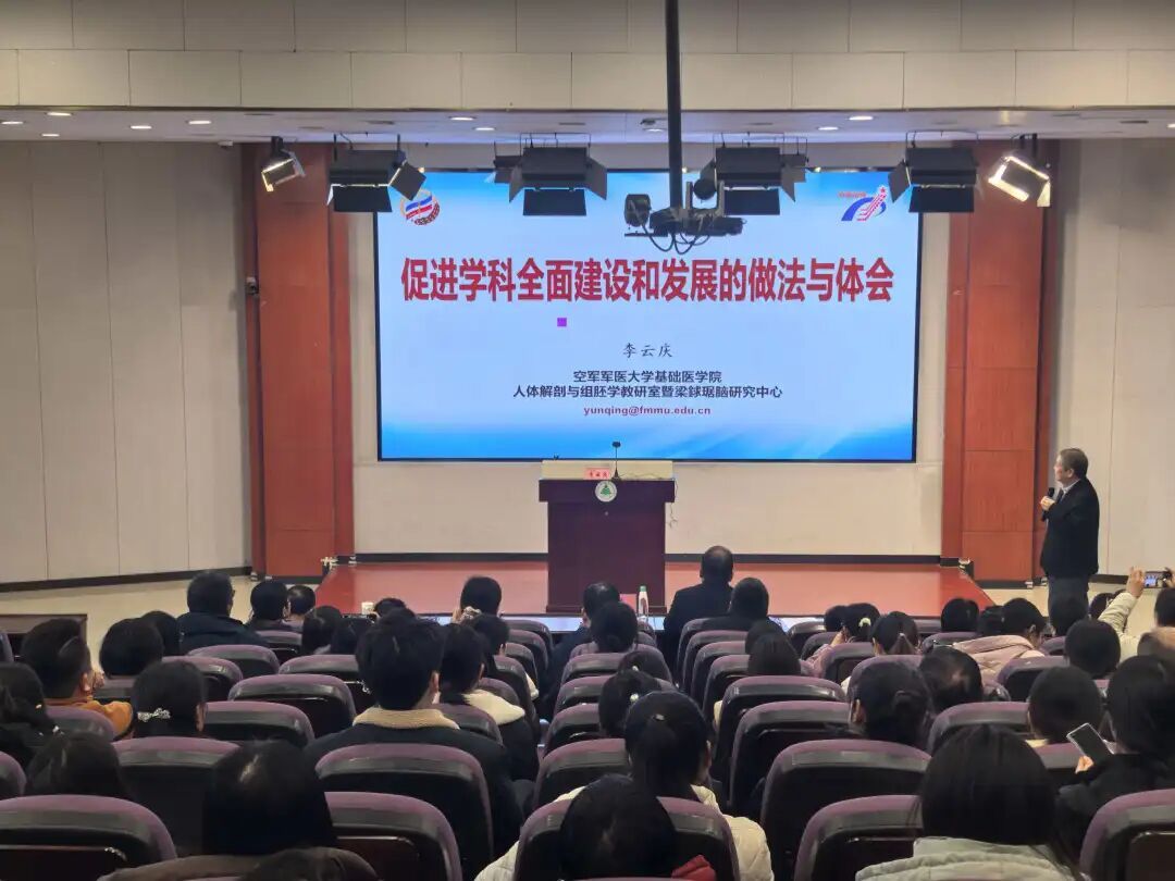 11月18日下午,空军军医大学梁銶琚脑研究中心主任、博士生导师李云庆教授应邀莅临我校,以“促进学科全面建设和发展的做法与体会”为主题开展专题讲座。讲座由副校长臧卫东主持,各院(部、系)负责人,全体无课教师参加此次讲座。