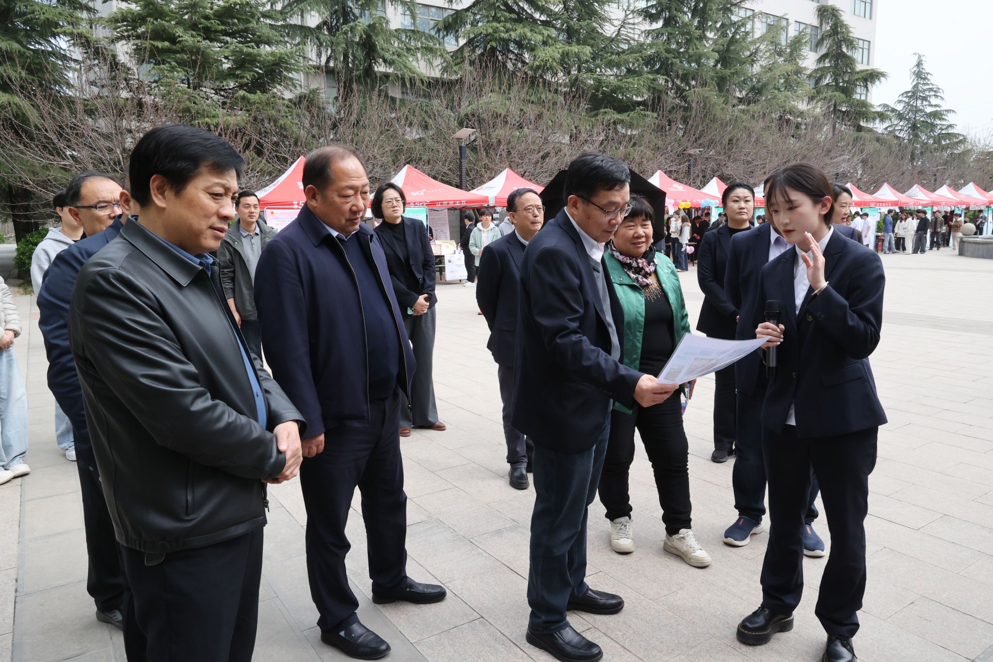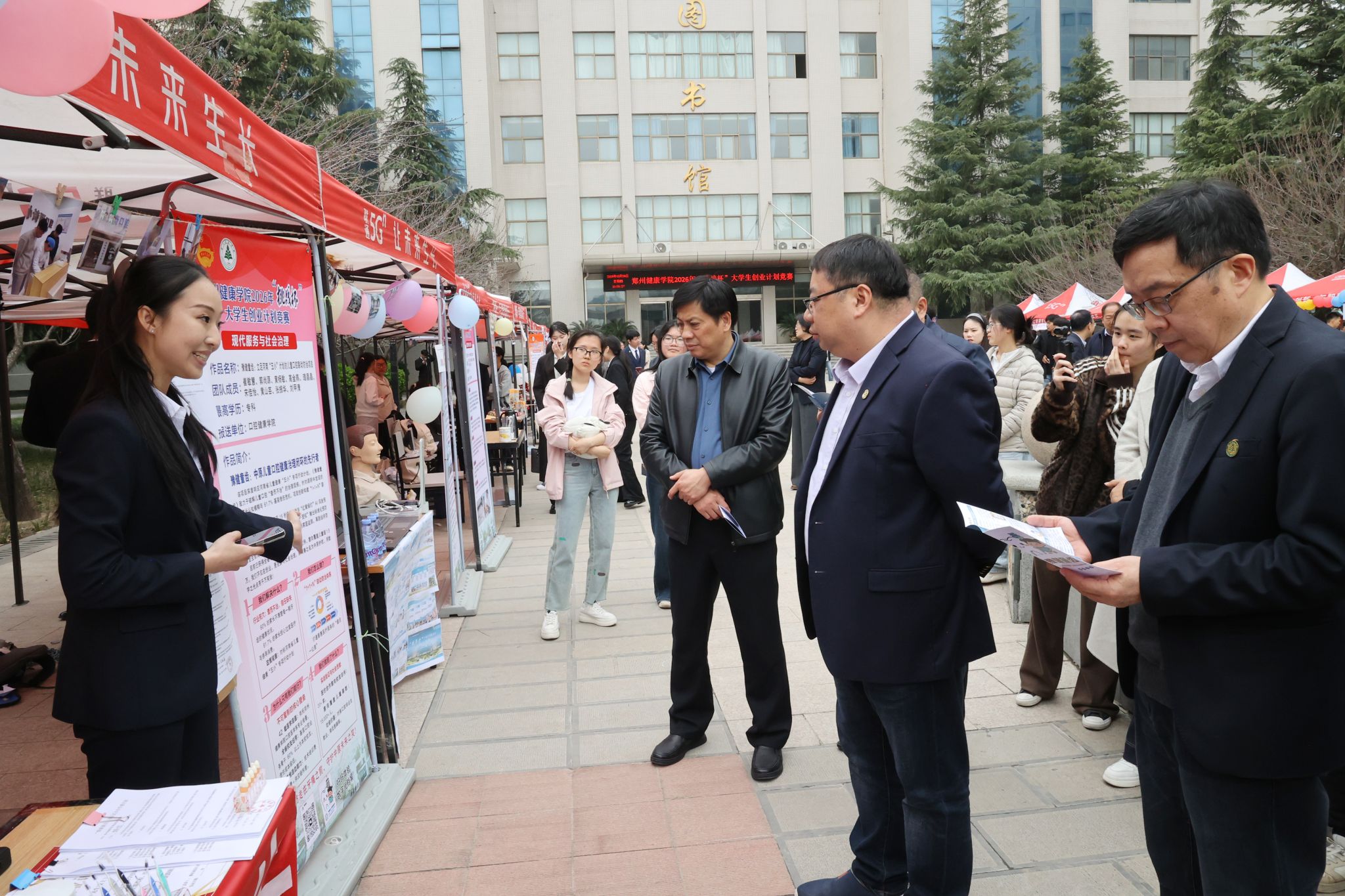 在上午的路演现场,校领导,相关部门负责人,各二级学院书记、院长、团学干部,各项目团队成员、指导教师及学生代表到场观摩。路演现场氛围热烈,参赛项目成员通过展板、实物演示、现场讲解等形式进行项目介绍。董事长王晨一行与参赛团队亲切交流,对同学们扎根专业领域、立足时代需求,将专业知识与实践创新紧密结合的做法给予了高度肯定,同时鼓励各参赛团队深耕细研,精益求精,不断优化项目内容,推动科创成果更好地落地生根。