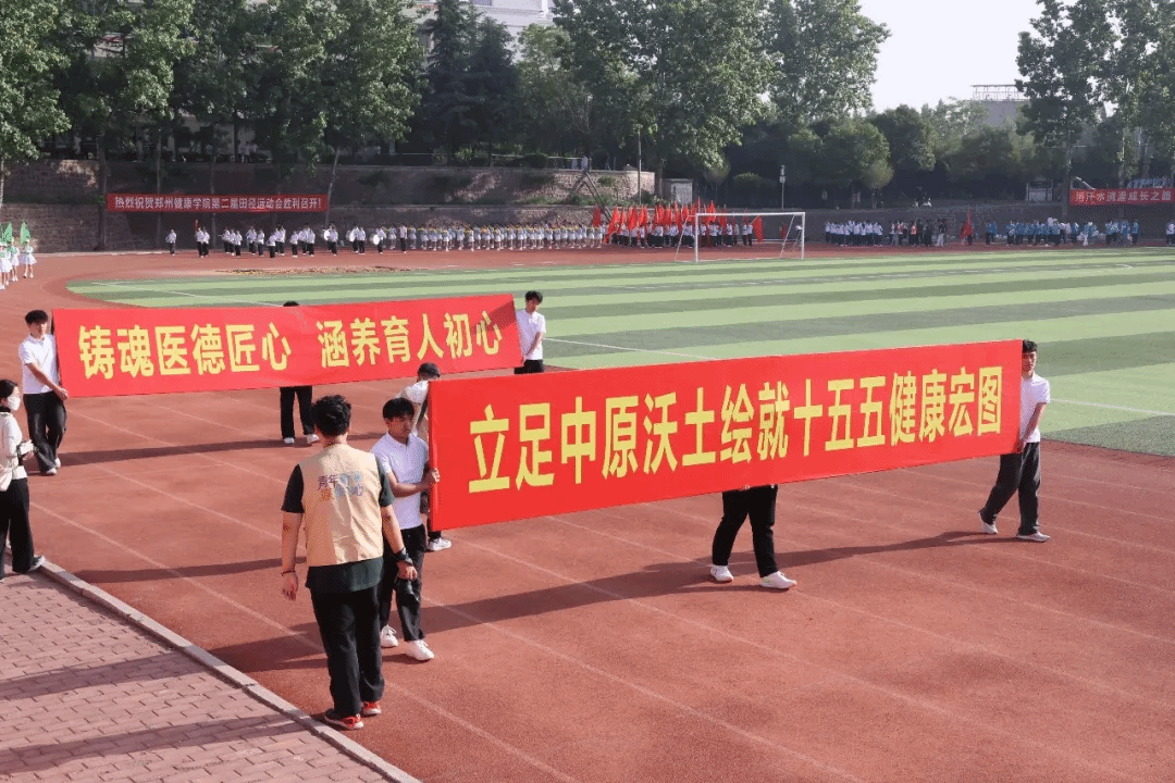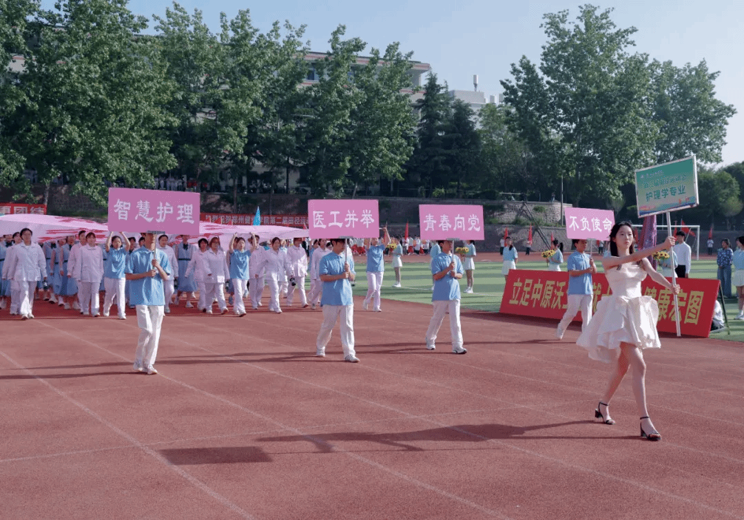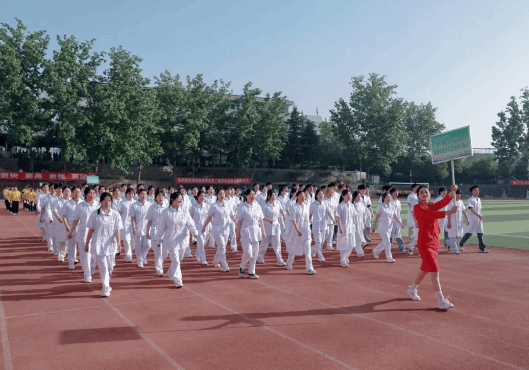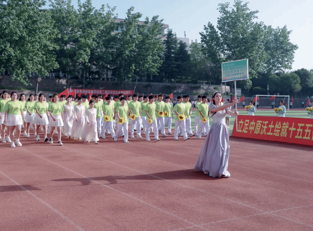 开幕式上,以“奋进‘十五五’ 健康向未来”为主题的团体操表演精彩纷呈、震撼全场,六支团体操表演队伍轮番上演,将医学特色、青春活力与校园底蕴完美融合。教职工团体操以《茉莉花》《天地龙鳞》《凤鸣朝阳》为脉络,温婉舞姿尽显育人初心,铿锵动作诠释奋进力量,凤凰造型寓意学校乘势而上、再启新程。第一篇章融合中医八段锦与现代医学急救技能,红黄旗帜交织,致敬古今医学先贤,传承“健康所系,性命相托”的医者誓言;第二篇章以金伞、武术、舞龙、扇舞绘就“爱心”“鲤鱼跃龙门”等图景,定格“健康”二字,诉说学校四十余载办学征程与本科新程的使命担当;第三篇章彩绸飞舞,队形变幻出胜利、十字、同心圆造型,彰显青年奋进力量与同心逐梦的坚定信念;第四篇章翻花流转、三色交织,人形波浪与生命之花惊艳亮相,武术表演刚劲有力,尽显医学智慧与自强不息的精神;第五篇章红绸舞动、绿扇翩跹,以灵动舞姿诠释立德树人初心,献礼健康中国宏伟蓝图。整场团体操表演气势磅礴、暖意融融,既展现了我校师生昂扬向上的精神风貌,也彰显了学校深耕大健康教育、坚守医学育人使命的责任与担当。赛场逐梦正当时,相信全体运动健儿将以饱满热情、拼搏姿态驰骋赛场,书写属于郑州健康学院的青春荣光!