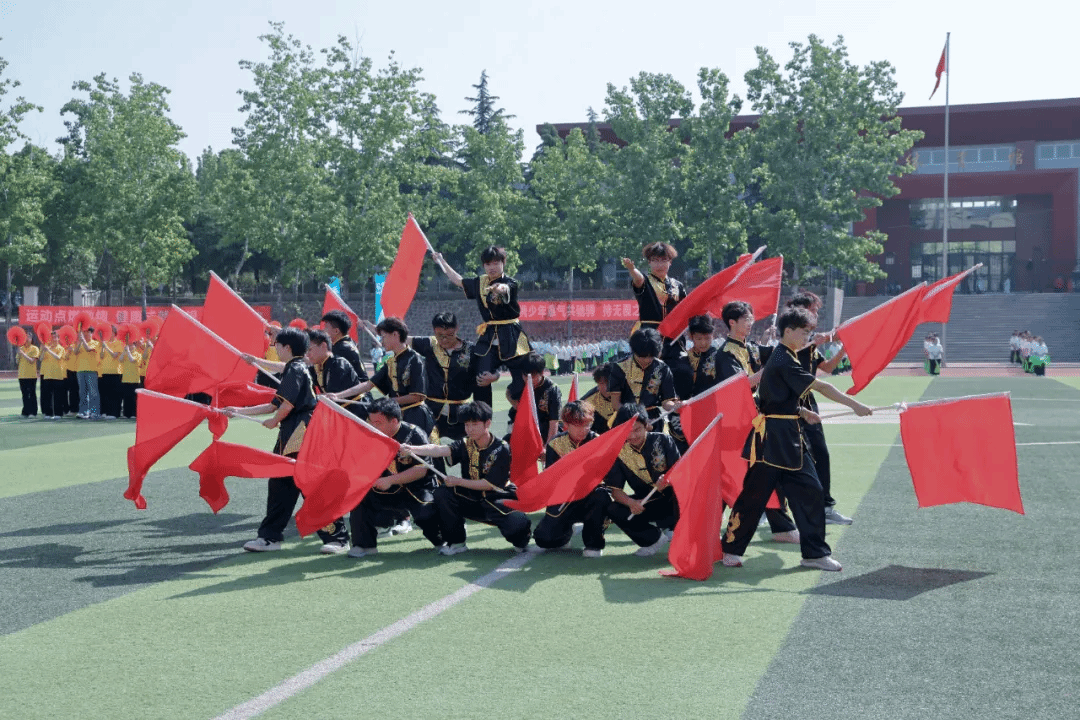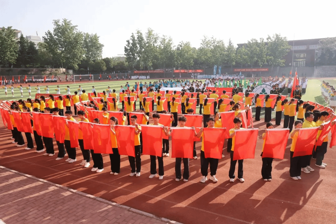 入场式后,举行了庄严的升国旗仪式。雄壮的《义勇军进行曲》响彻全场,五星红旗冉冉升起,全体师生庄严肃立、齐唱国歌,爱国爱校的赤诚之心在赛场激荡。
