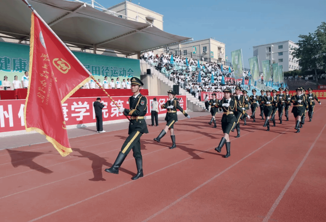 开幕式入场仪式气势恢宏、亮点纷呈。国旗队庄严肃穆,旗舞队旗帜飞扬、柔美与力量兼具,军鼓队鼓点铿锵、振奋人心,花束队手持向日葵向阳绽放,彩旗队五彩斑斓、如潮奔涌。裁判员代表队步伐稳健,秉持公平公正的专业态度;校友代表队荣归母校,尽显赤子情怀;教职工方阵精神抖擞,践行守护人民健康的己任;各院(部、系)学生方阵依次登场,以具有学院特色的创意造型和响亮的口号,充分展现出健康学子朝气蓬勃、团结奋进、笃行担当的青春风貌。现场花团锦簇,彩旗飘飘,掌声阵阵。