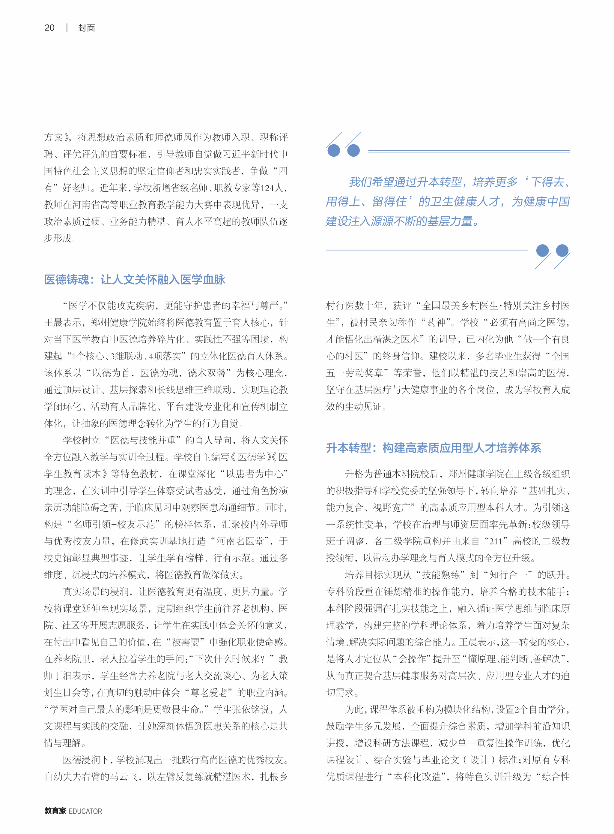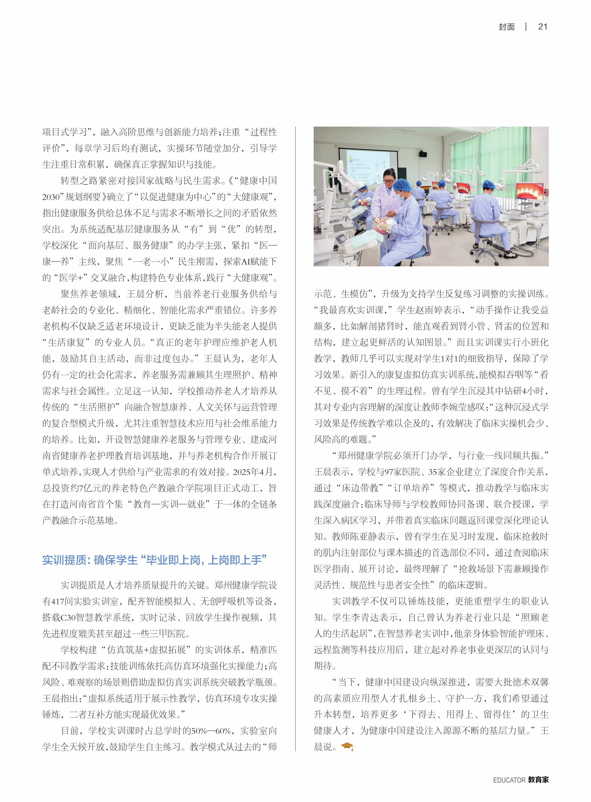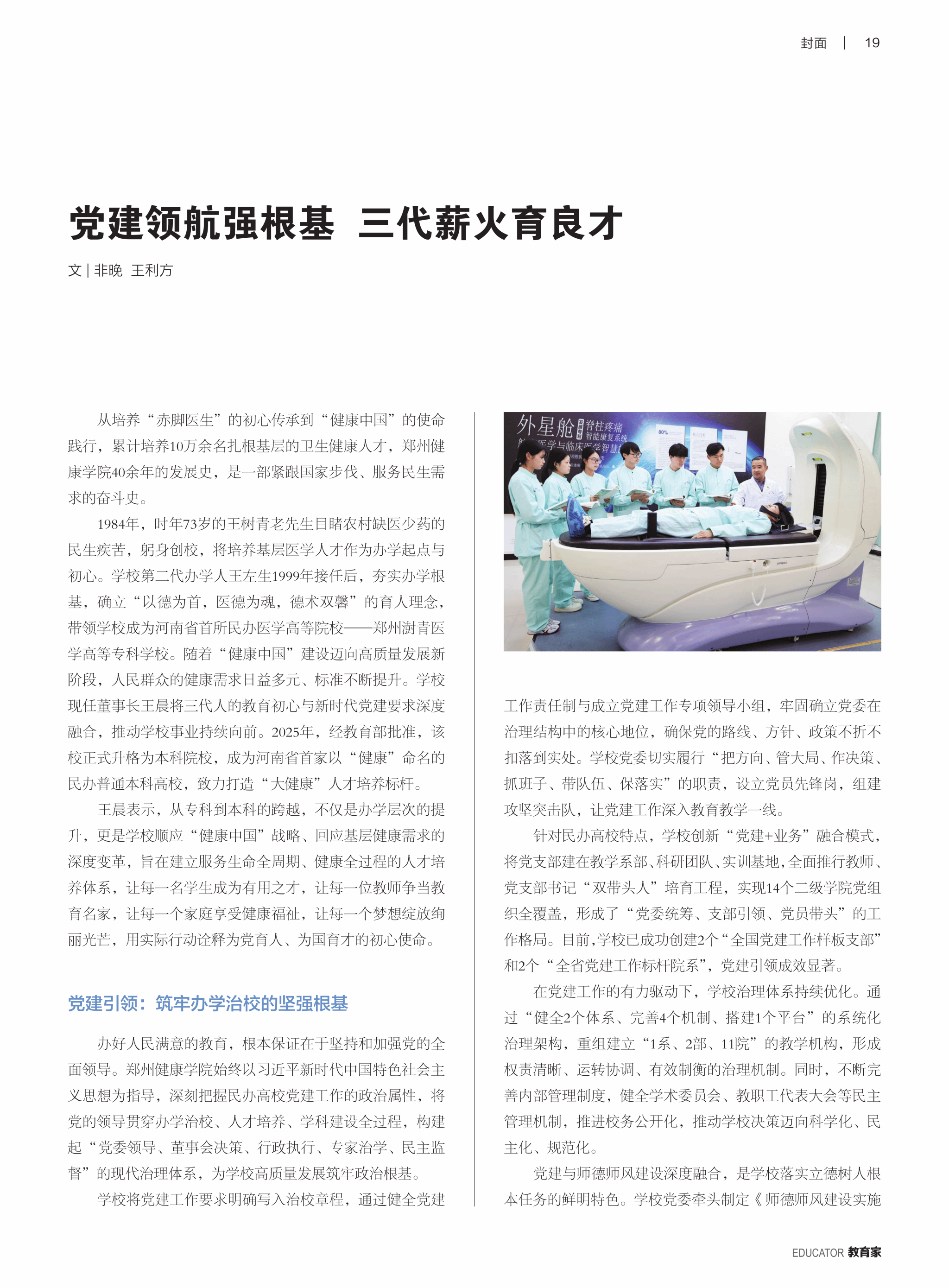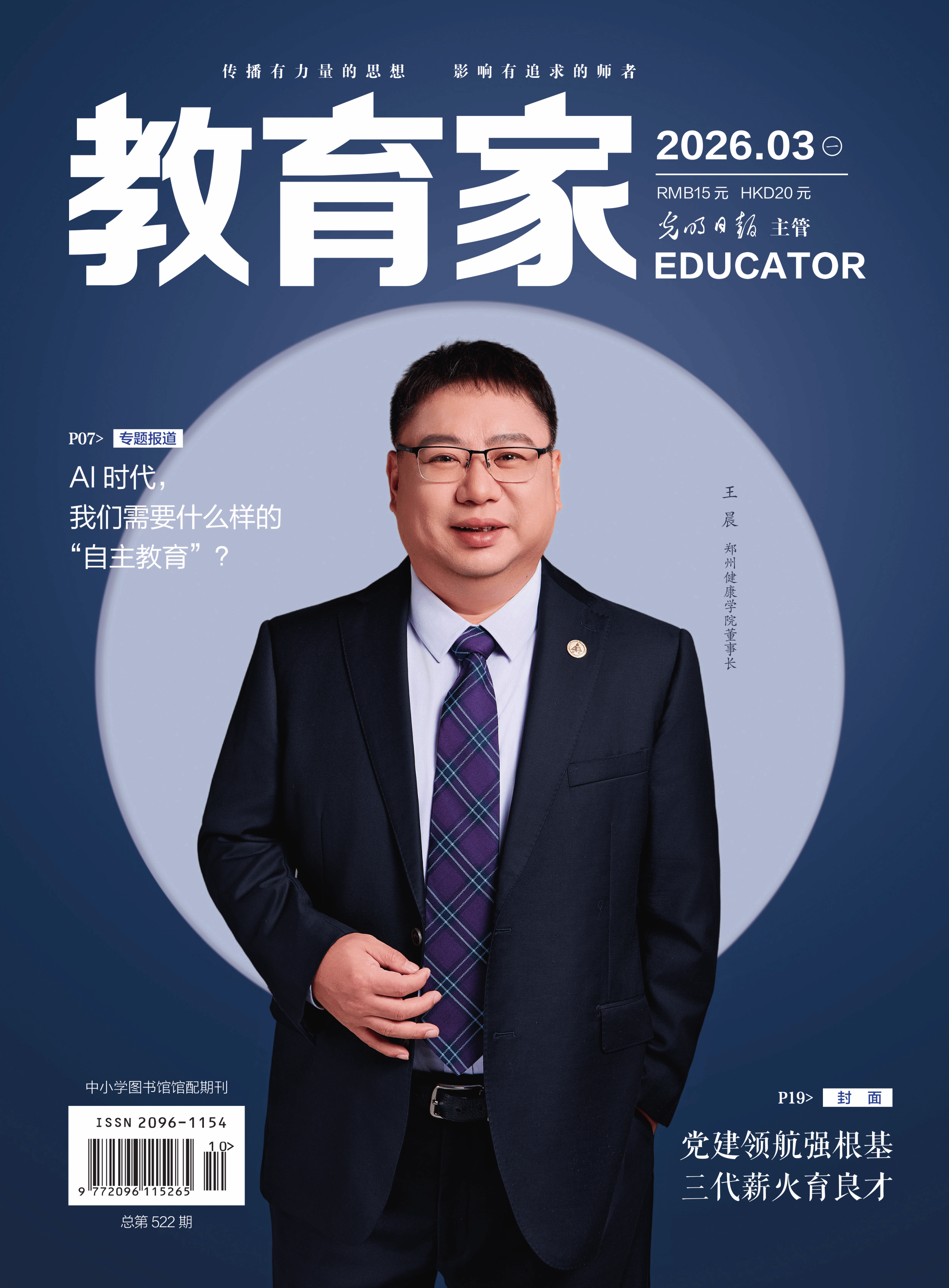 日前,由光明日报主管的杂志《教育家》总第522期出版。我校董事长王晨登上该期“封面人物”,杂志刊发了对王晨的深度专访文章《党建领航强根基 三代薪火育良才》,生动展现了王晨在教育领域的初心坚守、实践探索与责任担当。