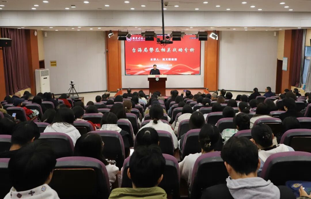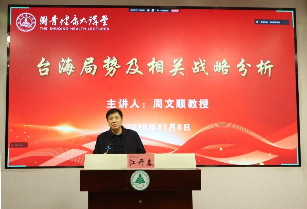 为深入学习党的二十届四中全会精神,精准把握台海局势,厚植家国情怀,11月6日下午,由党委宣传部主办,党委教师工作部、马克思主义学院协办的“澍青健康大讲堂”第四期专家报告会在学术中心2楼多功能报告厅开讲。特邀台海及国际问题专家,中共党史专家、郑州大学港台人文研究中心主任周文顺教授作专题报告。校领导、副科级以上干部、教师和学生代表聆听了报告会。会议由党委副书记、副校长、工会主席江开春主持。