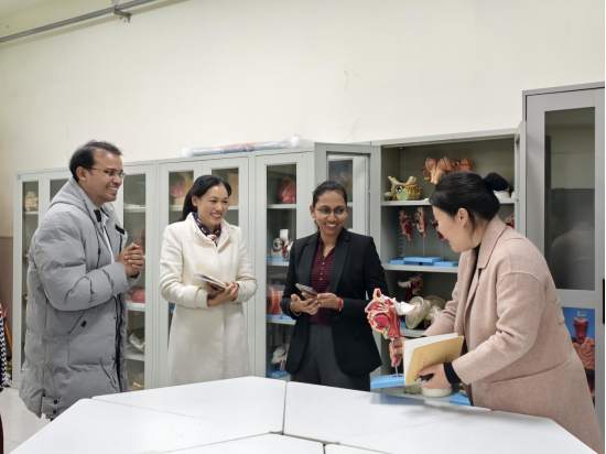 研讨会最后,健康医学院副院长侯小丽带领Ms. Rani参观了我校的人体解剖实验室与解剖虚拟仿真实验室。在解剖实验室,李建华主任详细介绍了标本的采集、制作与保存流程,以及实验室的安全管理规范;在虚拟解剖仿真实验室,Ms. Rani 亲身体验了虚拟解剖操作系统,该系统通过三维建模技术还原人体结构,可实现多角度观察、反复操作,有效弥补了传统实验教学的局限性。Ms. Rani 对我校先进的教学设施与规范的管理体系给予高度评价,认为此次参观学习进一步加深了对我校人体解剖学教学工作的了解,为后续两校的学术合作奠定了良好基础。