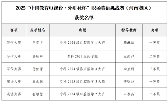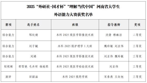 作为首次以本科院校身份参与河南省大学生外语能力大赛的高校,我校本科选手参与了综合能力、演讲、短视频赛项。专科选手则在职场英语挑战赛演讲、写作赛项中展开角逐。为全力备赛,健康人文教育部公共英语教研室积极选拔骨干教师组建指导团队,有序开展各赛项校内初复赛以遴选选手,并针对赛项特点进行个性化备赛辅导。指导教师全程陪伴赋能,从语言表达优化、中国故事素材挖掘到实战技巧提升,为学生提供精准指导;选手们充分利用课余时间反复演练,在备赛中锤炼本领,在竞争中突破自我,展现出饱满的学习热情与坚韧的进取精神。此次成绩是英语教学践行“以赛促教、以赛促学、以赛促改”理念的生动实践,既彰显了健康人文教育部在复合型外语人才培养中的扎实成效与责任担当,也为英语教学改革提供了鲜活样本。