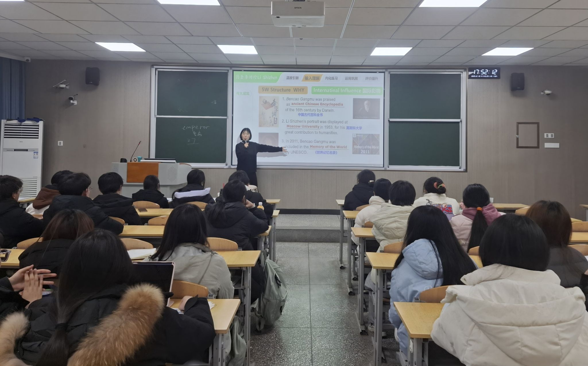讲座伊始,李卫丽老师首先向同学们阐述了让中国文化走向世界的重要意义,强调在全球化的时代背景下,传播中国传统文化是每一个青年学子的责任与使命。随后,刘亚伟老师以李时珍为切入点,详细介绍了如何描述一位历史名人及其贡献。她用生动形象的语言,将李时珍的生平简历,尤其是其数十年如一日钻研医学、实地考察采集草药的感人故事娓娓道来,让同学们深刻感受到了中国古代科学家的执着与奉献精神。在讲解过程中,老师们巧妙地为同学们示范了如何用英语准确、流畅地介绍中国传统文化,并通过积极互动让同学们参与其中,鼓励同学们勇于用英语表达自己对中国文化的理解,激发了同学们的学习热情,增强了学习信心和动力。