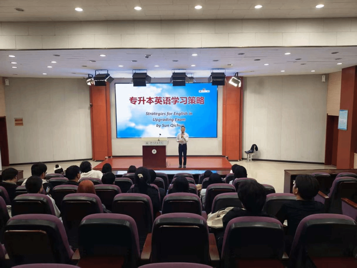 为进一步明确2025级专科学生专升本备考方向,夯实英语学习基础,助力学生成长成才与学历提升,健康人文教育部于2026年3月25日(周三)17:30—19:00,在学术中心二楼学术报告厅举办“专升本英语学习策略”主题学术讲座。本次讲座由健康人文教育部外语教研室孙启春老师主讲,2025级药学本科班沈为勤同学担任主持,全体有志于学历提升的2025级专科学生参加本次活动。