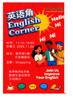 本周三(2025年11月26日)17:10–18:40,我们将如期举办本学期第3次英语角活动!本期主题为“Shopping”(购物畅谈),欢迎大家踊跃参与!