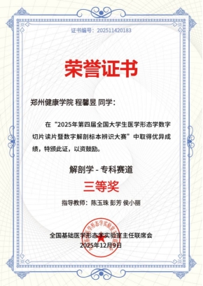近日,“2025年第四届全国大学生医学形态学数字切片读片暨数字解剖标本辨识大赛”全国总决赛圆满落幕。我校2025级医学影像技术1班程馨昱同学凭借扎实的理论知识与标本辨识能力,在解剖学专科赛道脱颖而出,荣获三等奖,为学校赢得了荣誉。