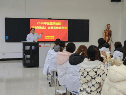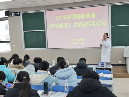 为传承中医药文化精髓,锤炼中医针灸推拿专业学子临床实操本领,夯实人才培养根基,进一步营造“以赛促学、以赛促练、以赛促建”的良好氛围。近日,2026中医临床技能(针灸推拿)大赛宣传动员会在我院顺利举行。动员会上,各个老师详细解读了2026中医临床技能(针灸推拿)大赛的赛事背景、组织机构、参赛对象、竞赛内容及赛程安排,重点强调了本次大赛的核心宗旨——以赛事为载体,检验针灸推拿专业教学成果,搭建学子交流学习、展示技艺的平台,推动针灸推拿技能的规范化传承与创新发展,助力中医药事业高质量发展。