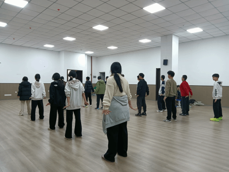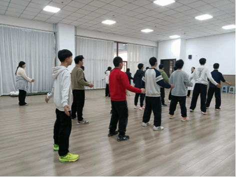 课程伊始,教学聚焦于八段锦的“筑基之始”——起势与站桩。范老师向同学们强调:“就像盖楼需要坚实的地基,练好八段锦的关键就在于这一个‘起势’。”通过分解教学,范老师将“双脚打开,与肩同宽,膝盖微屈,松腰敛臀”等动作要领转化为学生们易于理解的口诀。同学们全神贯注,在范老师的逐一纠正下,努力体会“脚下生根”的稳定感与“顶头悬”的挺拔感,从喧闹的课间状态迅速“收神”,进入身心合一的学习状态。