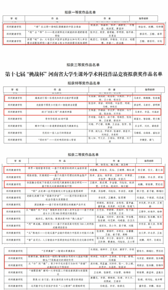 近日,河南省大学生课外学术科技作品竞赛组委会公示了第十七届“挑战杯”拟获奖作品名单,郑州健康学院健康医学院学子凭借扎实的专业素养、创新的科研思维与严谨的实践探索,在众多参赛作品中脱颖而出,一举斩获2项特等奖、3项一等奖、4项二等奖、4项三等奖,获奖等级与数量均创历史新高,充分展现了学院在医学人才培养与科研创新领域的卓越实力。