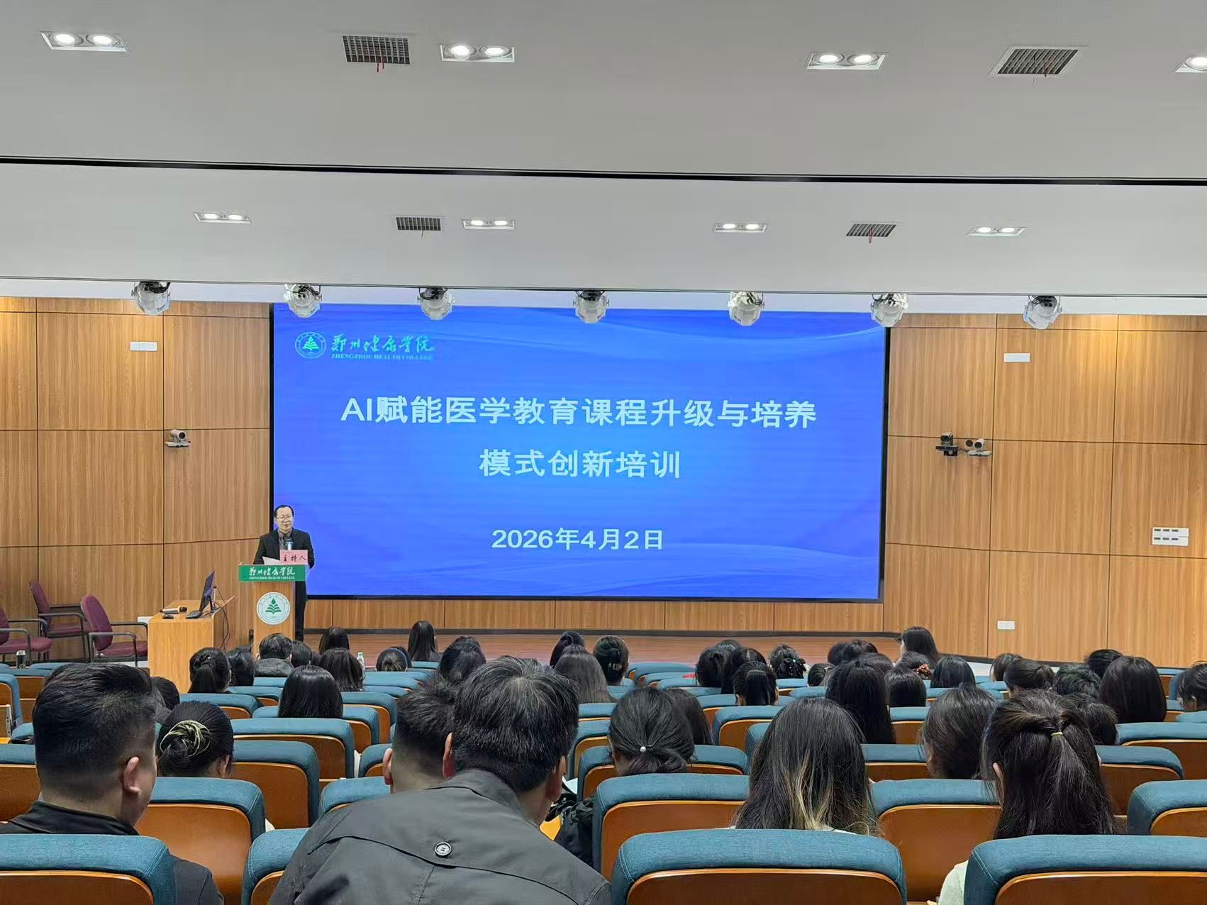为加快推进智慧课程建设,助力教学创新与人才培养质量提升,2026年4月2日下午,教务处在学术中心三楼道德大讲堂组织开展“AI赋能医学教育课程升级与培养模式创新”专题培训,本次会议邀请了河南医药大学免疫学系副教授、国家本科教育教学评估评审专家、河南省一流课程及医学教育优质课评审专家,智慧树高等教育研究院特聘专家孙爱平,会议由教学运行与课程建设科副科长王浩亮主持。