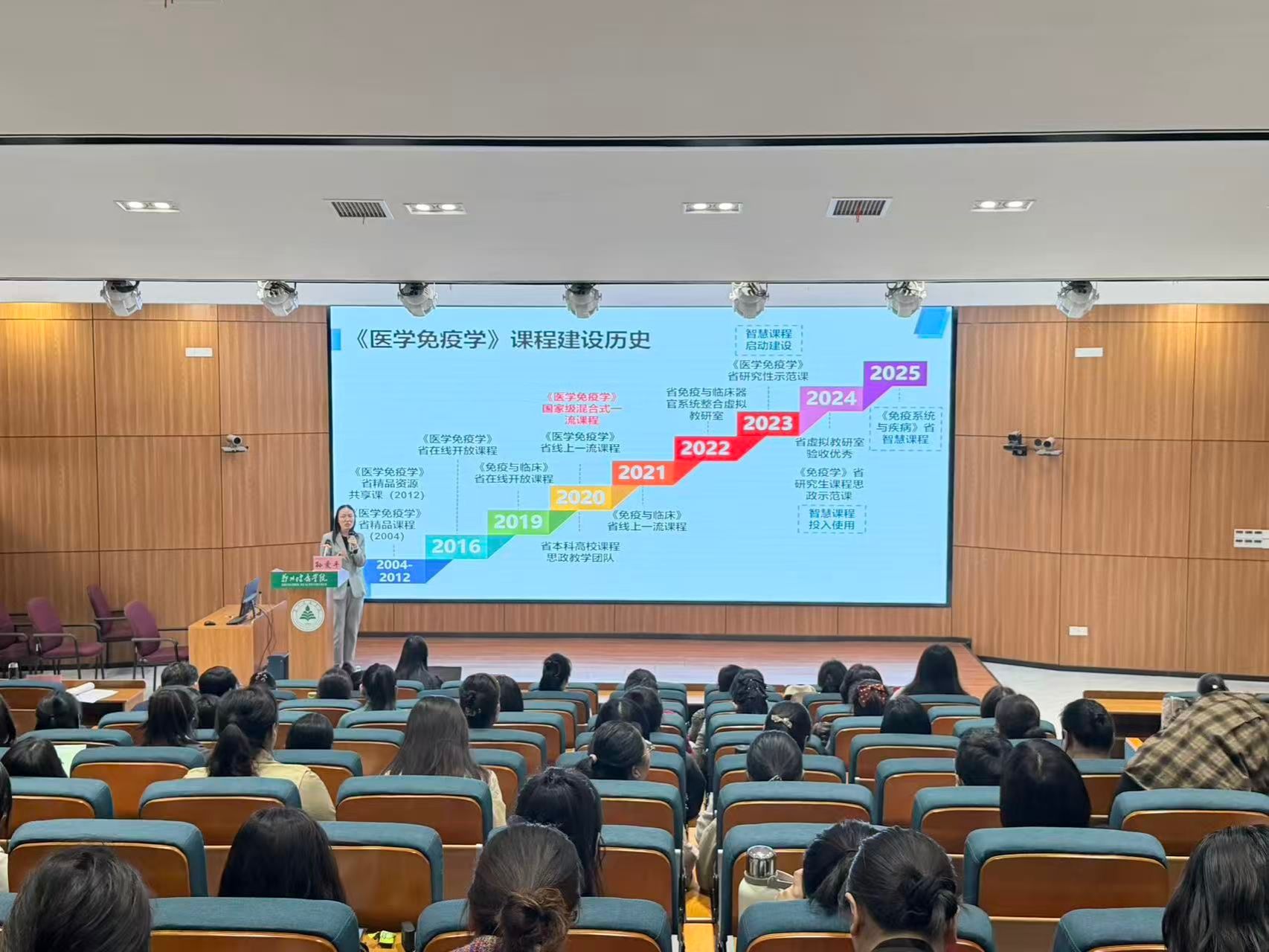 孙爱平以《AI赋能·四图领航:免疫学国家级一流课程智慧化升级与教学实践》为题,分享一流课程建设经验,展示了AI技术与“四图”工具推动课程智慧化转型的实践路径。智慧树网金课咨询师邓淑垚作《智慧课程及专业培养体系建设》报告,介绍了人工智能在课程建设以及专业建设中的构建理念与应用场景。每个主题报告后均设答疑环节,参会教师围绕课程升级、AI落地应用、专业建设等与主讲人深入交流,取得良好的培训效果。
