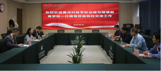 2025年9月25日上午,黄河科技学院远程与继续教育学院院长王其顺一行来访我校,就高等学历继续教育工作进行友好交流。学校社会服务与国际交流党总支副书记陈容、继续教育学院副院长李伟涛等出席交流会议。会议在综合教学楼207会议室举行,由继续教育学院张雷主持。