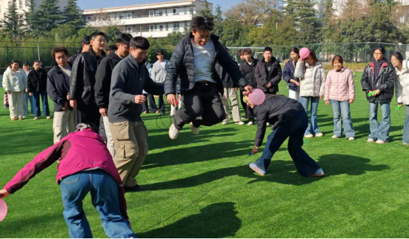 本次活动将思想政治教育自然融入团队协作实践,精心设计了“动力火车”“横扫千军”“两人三足”等一系列富有挑战性与趣味性的项目。参与成员随机组队,在协作中迅速建立默契。活动现场气氛热烈,尤其在“两人三足”环节中,队员们从初始步调不一到后期协调一致、健步如飞,充分展现出信任与协作所带来的团队力量。