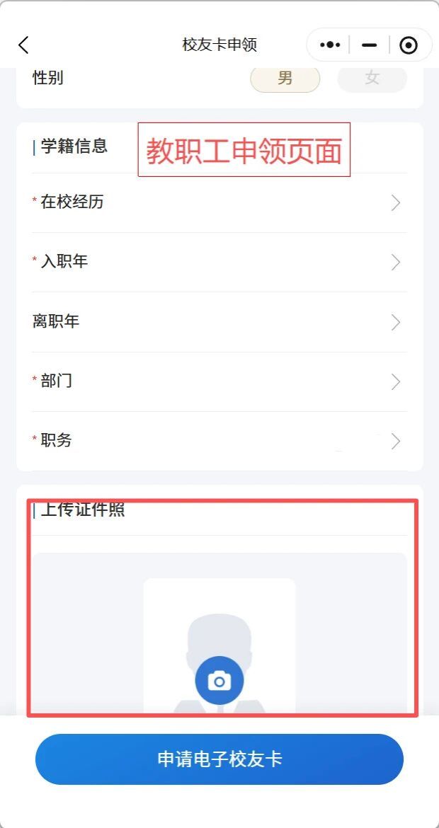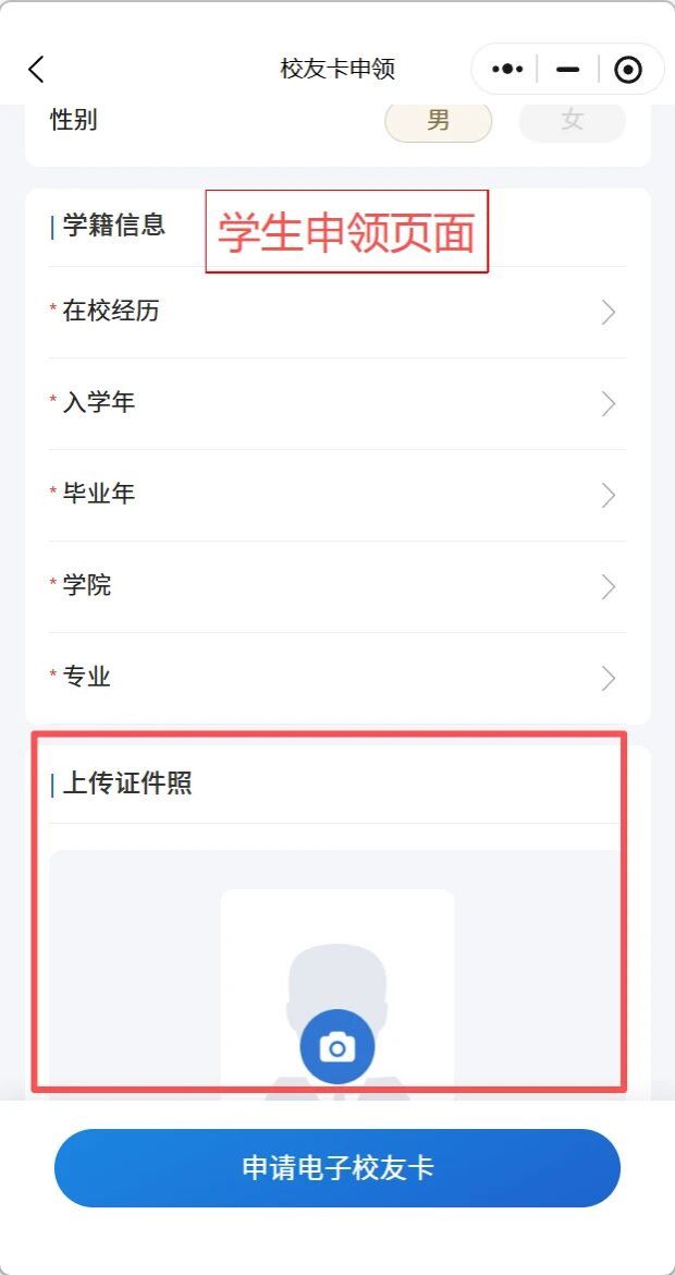 进入校友卡申领页面,根据不同的身份(学生:“在读及已毕业同学”或教职工:“在职教职工及曾在校工作”)分为两种申请页面,根据不同所需信息进行填写并上传证件照(注意标有 * 为必填项目),点击申请电子校友卡后等待审核通过即可。
