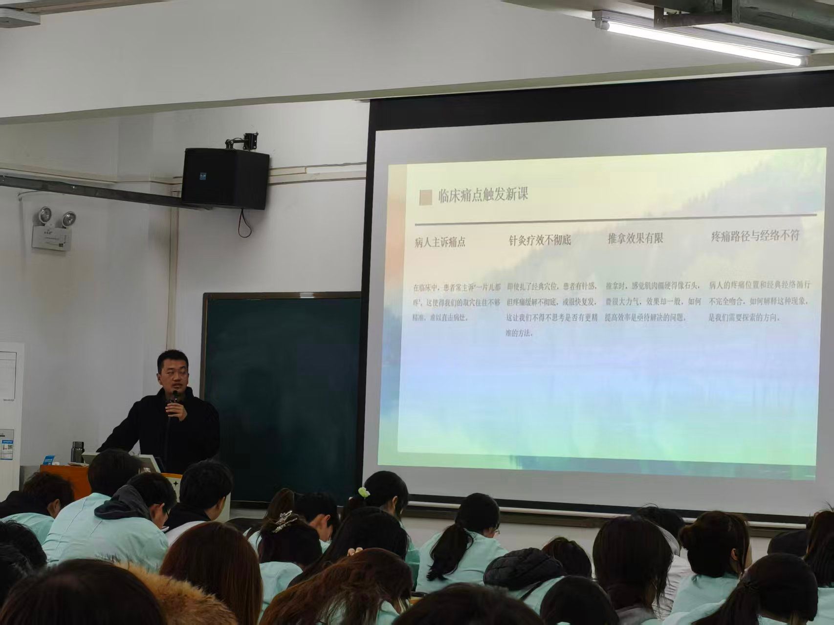 讲座伊始,高航医师直击临床痛点,指出患者常主诉“一片儿都疼”、经典取穴疗效不彻底、推拿效果有限以及疼痛路径与经络循行不符等现实困境,引发了在场师生的强烈共鸣。他随即提出,解决之道在于从传统的“辨证论治”升级为“辨证+辨构”的双轨模式。