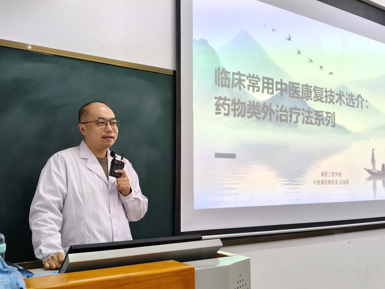 2025年12月16日晚,中医康复教研室白海春老师在招教中心Z2202教室为2024级中医康复技术专业全体学生带来了一场主题鲜明、内容丰富的专题讲座。本次讲座以“临床常用中医康复技术选介:药物类外治疗法系列”为核心,紧扣中医适宜技术的内涵,结合学生当前所学《推拿学》《针灸学》课程,深入浅出地讲解了多项经典而实用的外治方法。