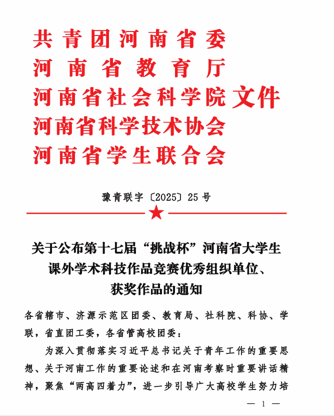 获奖第十七届“挑战杯”河南省大学生课外学术科技作品竞赛
